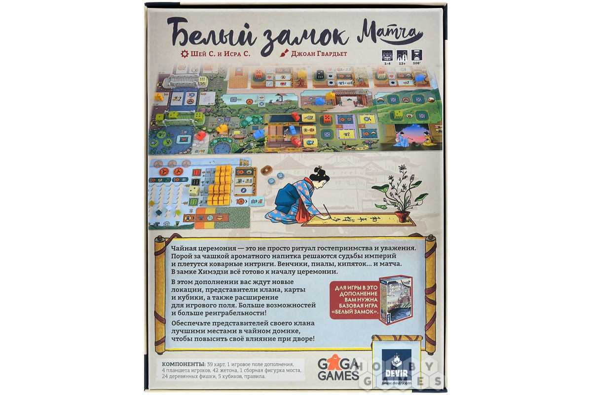 "Белый замок: Матча" – это дополнение к "Белому замку", которое привнесёт в игровую механику церемонию, посвящённую чаю, и откроет новые стратегические возможности. Чтобы заслужить уважение даймё Химэдзи, одной армии недостаточно – понадобится освоить искусство заваривания матчи. Теперь с помощью особых зелёных кубиков и венчика вы сможете занять – как минимум попытаться – лучшие места в чайном домике и укрепить своё влияни в регионе! А если настроение будет лиричное, всегда можно просто посидеть у красивого пруда, помедитировать и накопить ресурсов для будущих свершений.