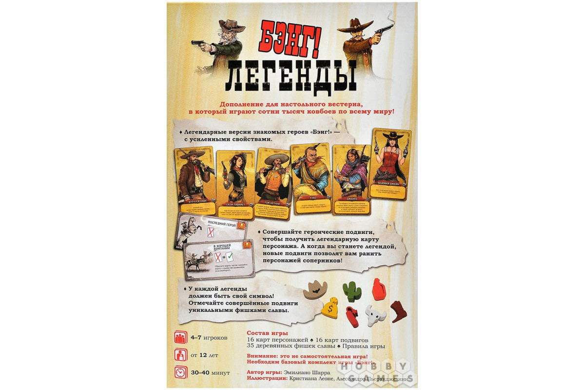 "Бэнг! Легенды" – дополнение, которое превращает обычную игру в эпическую сагу. Здесь знакомые персонажи обретают новую силу, а ваши решения определяют, останетесь ли вы в памяти как бесстрашный ковбой или канете в небытие. Готовы ли вы бросить вызов судьбе и написать свою легенду?