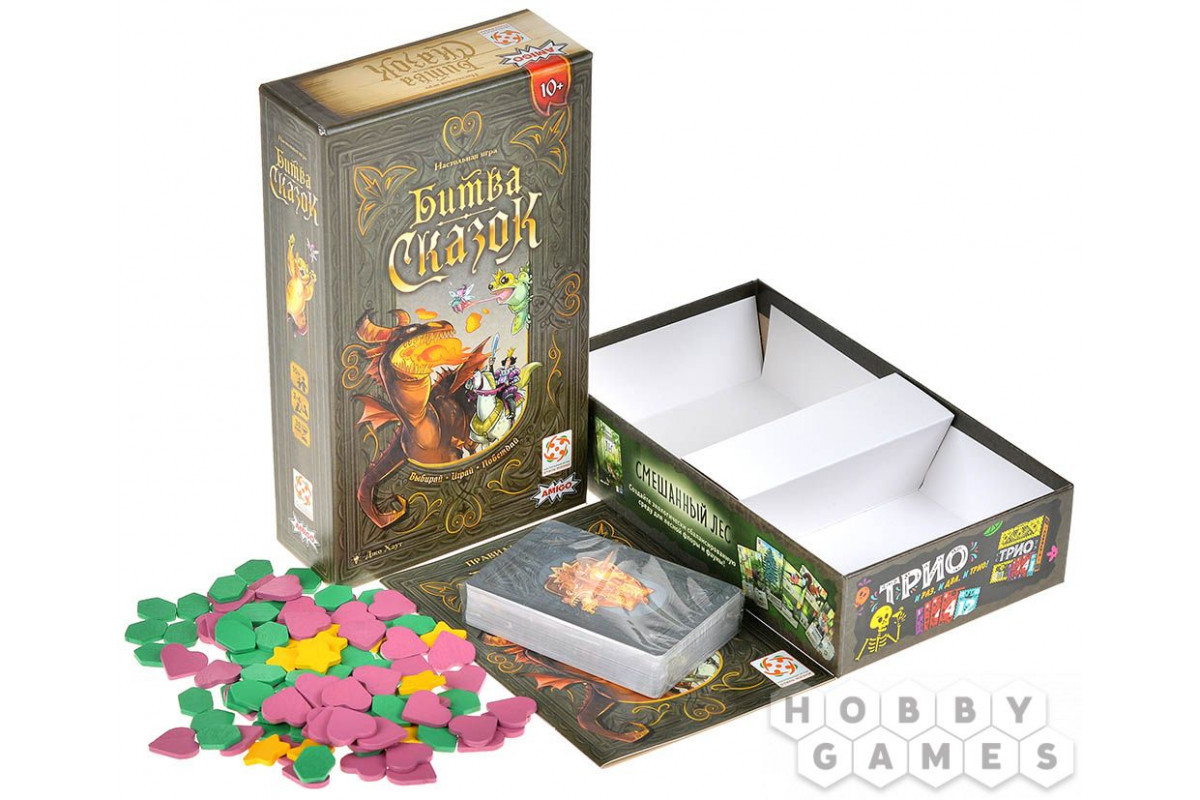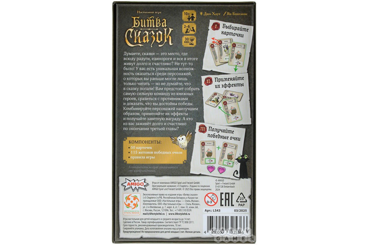 В карточной настольной игре "Битва сказок" вам предстоит собрать самую сильную команду героев самых различных сказок. Это могут быть волшебные животные, королевские особы, магические персонажи и даже монстры со злодеями! У каждого персонажа есть сильные и слабые стороны в виде уникальных способностей и числовых значений. А ещё герои одной сказки лучше работают в команде, учитывайте это при формировании своей сказочной команды. Попробуйте завершить третью главу своих приключений с наибольшим количеством очков и станьте победителем!
