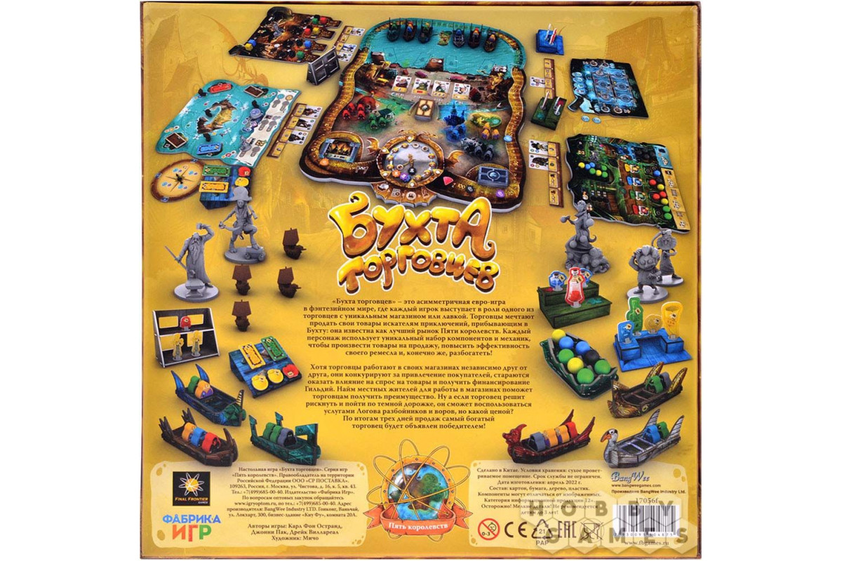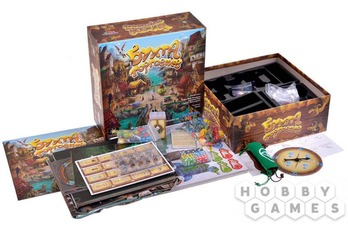 В настольной игре "Бухта торговцев" вам предстоит взять на себя роль одного из классических фэнтезийных торговцев. Вы можете стать алхимиком и продавать различные эликсиры и компоненты для них, или кузнецом и ковать на продажу разнообразные доспехи и оружие, а можете и вовсе стать владельцем гостиницы. Каждый лавочник обладает своими уникальным игровыми компонентами и игровым планшетом, а потому тактика и стратеги при игре за каждого из них будет отличаться. Но как бы там не было, конечная цель у всех одна – удовлетворить потребности наибольшего числа покупателей, которые заплывают сюда во время своих приключений. И запросы у них бывают весьма специфичны.