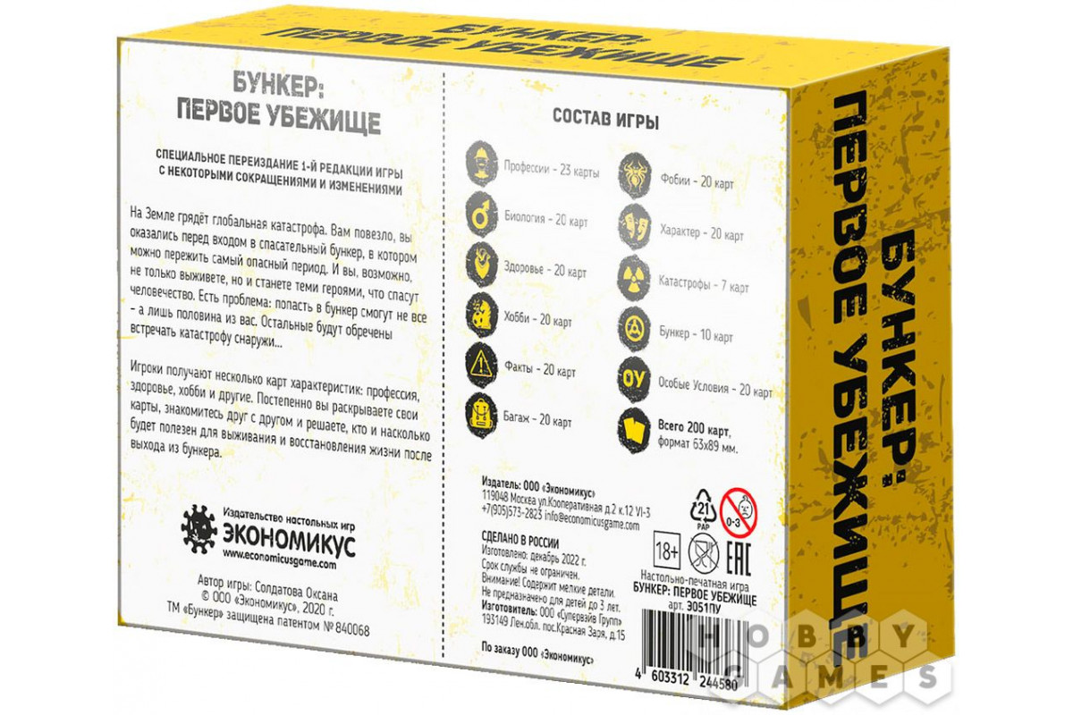 Это издание максимально приближено к оригинальной первой редакции "Бункера", но с рядом изменений. Внутри вы найдёте сокращённые колоды – по двадцать карт в каждой, включая семь вариантов глобальных катастроф. Отсутствуют бланки голосования, органайзеры для карт, а также механики исследования бункера и финальных испытаний. Однако здесь есть уникальные колоды Фобий и Характера, не вошедшие в поздние редакции.