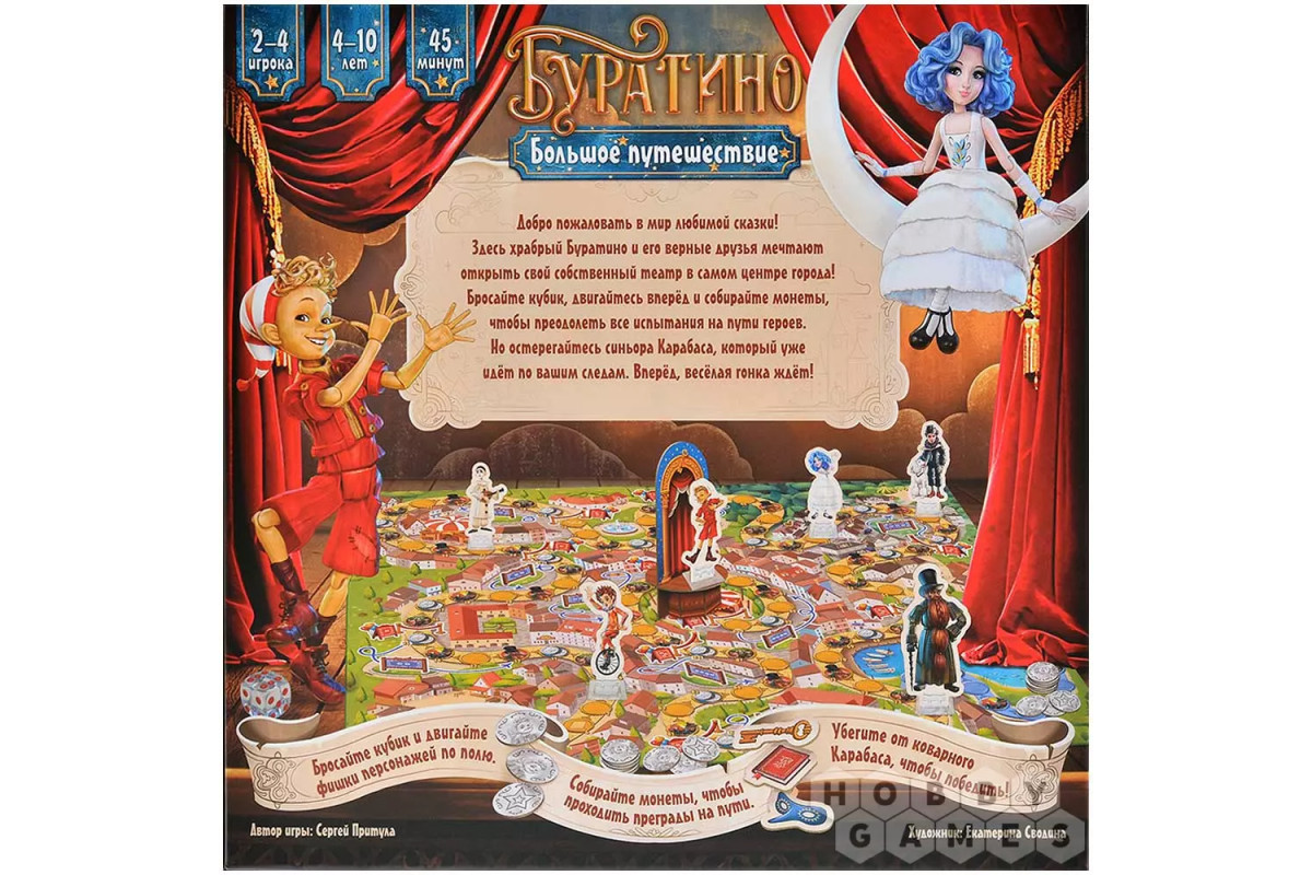 Используйте находчивость и особые жетоны, чтобы получить преимущество в игре, избежать ловушек и помочь товарищам. Самое главное – не подпускайте близко злого Карабаса... Если ваша фишка остановилась на клетке Карабаса – берегитесь! Злобный кукловод сразу же бросается в погоню. И если он обгонит вашего героя – вам придётся расстаться с одной монеткой.