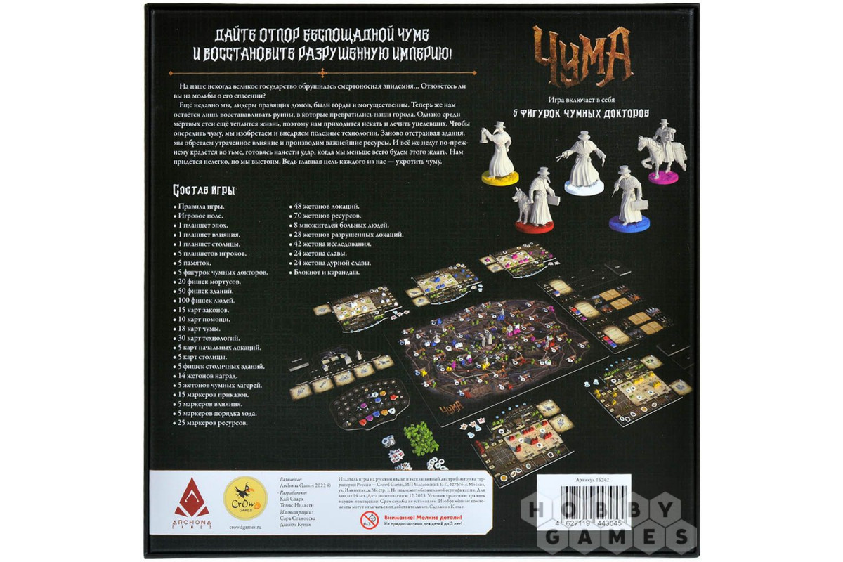 "Чума" – это атмосферная кооперативная настольная игра, в которой вы отправляетесь в охваченный бедствием город, чтобы спасти его от надвигающейся гибели. Игроки управляют персонажами с уникальными способностями, исследуют локации, ищут улики и сталкиваются с ужасами, подтачивающими не только тела, но и волю. Механика игры построена на сценариях с нелинейным развитием, где каждое ваше действие влияет на то, каким будет финал.