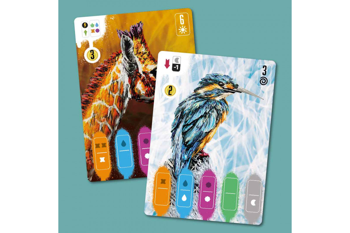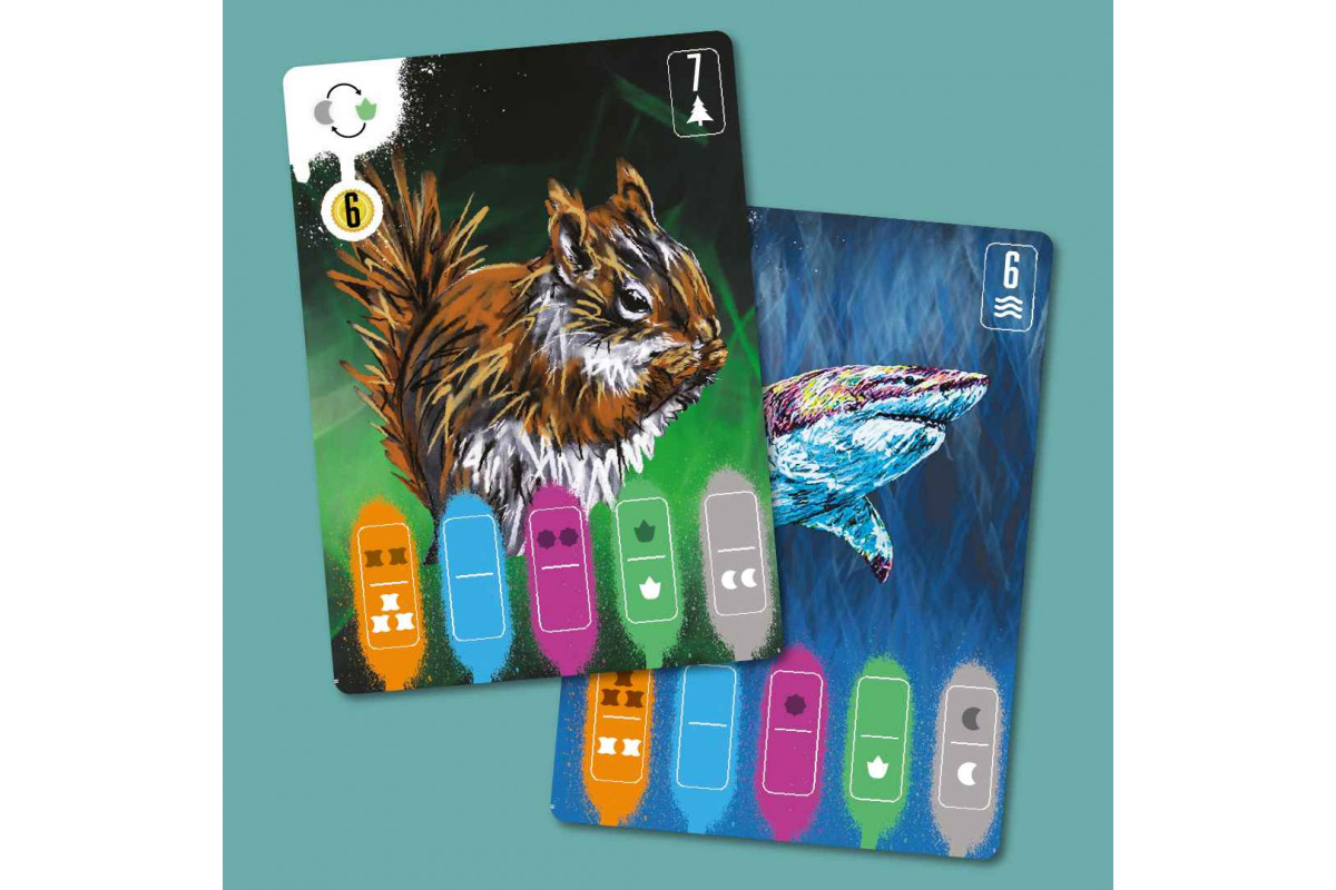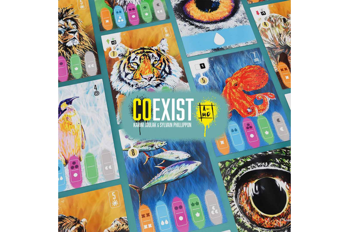 Coexist centers on open-drafting and resource-management mechanisms. Releasing animals into the wild earns you points and unlocks special skills, but you need to recognize your limits and avoid overestimating your team's capabilities. The first player to release five species into the wild triggers the game end, then the player with the most points wins.