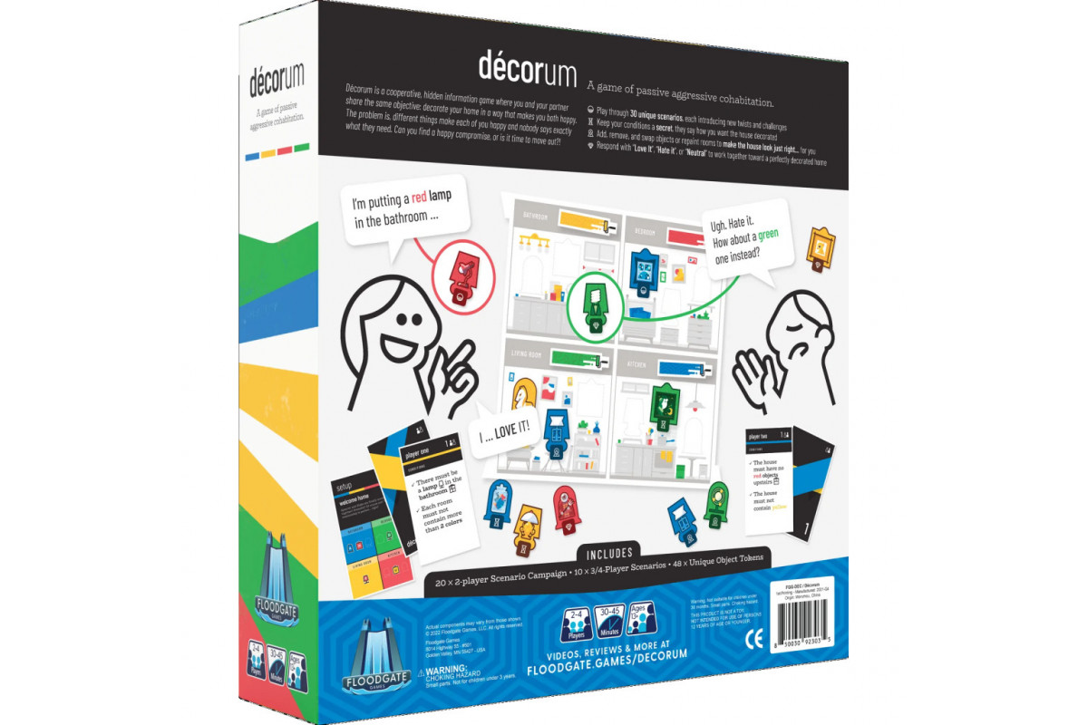 DÉCORUM is a cooperative, hidden information game where you and your partner share the same objective: decorate your home in a way that makes you both happy. The problem is, different things make each of you happy and nobody says exactly what they need.