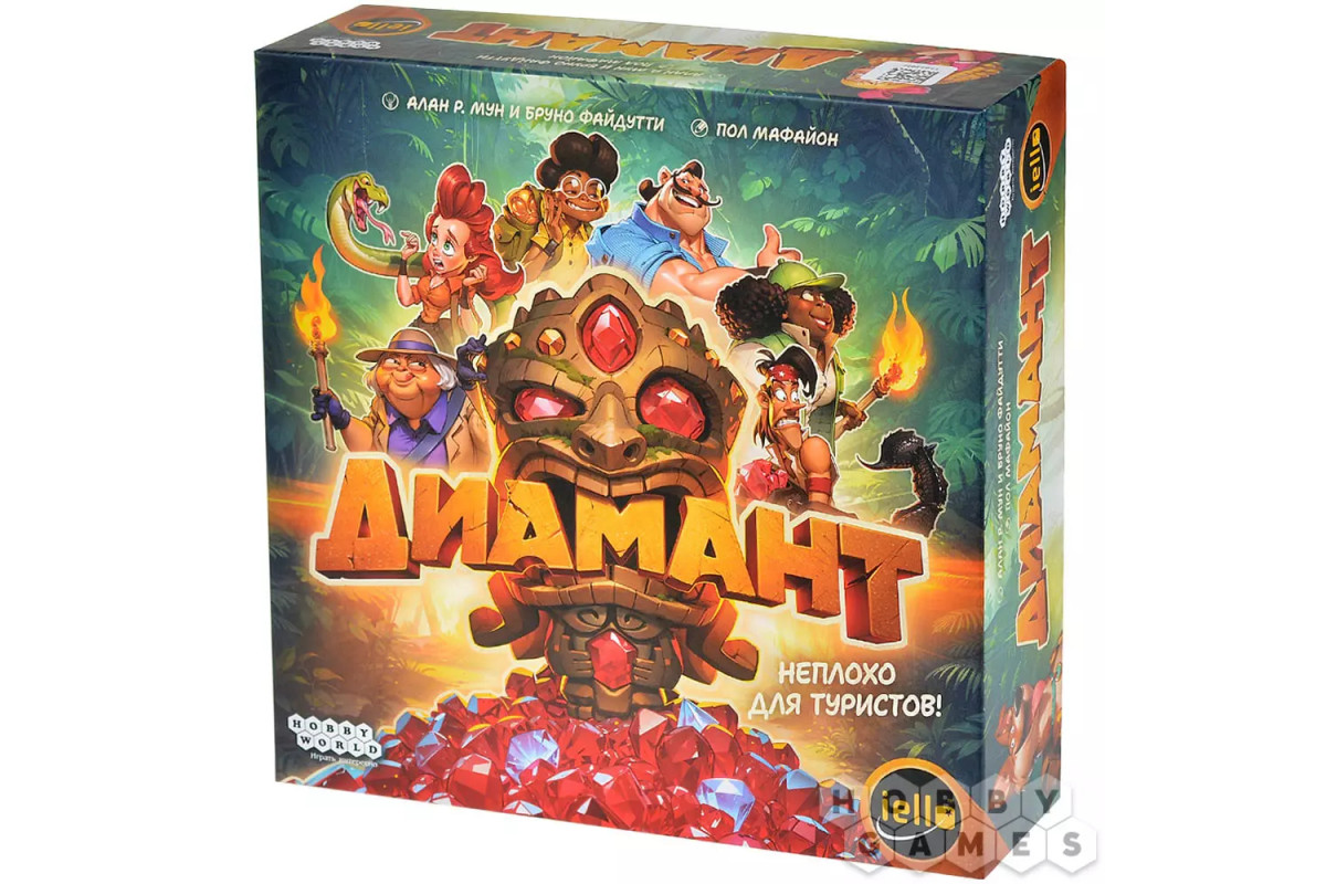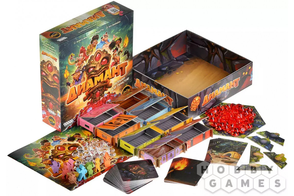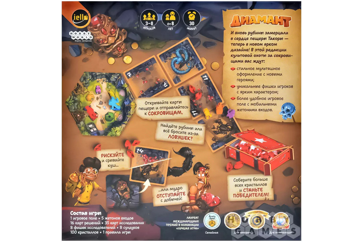 "Диамант" – это динамичная семейная настольная игра про риск и жадность, получившая новое яркое оформление. Вас ждут стильный мультяшный дизайн, харизматичные персонажи и удобное поле с подвижными жетонами входов в пещеру. Игра идеально подойдёт для семьи, компании друзей и вечеринок, легко объясняется новичкам и при этом каждый раз создаёт новые напряжённые ситуации за столом. Неоднократный лауреат международных премий и заслуженно считается одной из лучших игр для знакомства с настольным хобби.