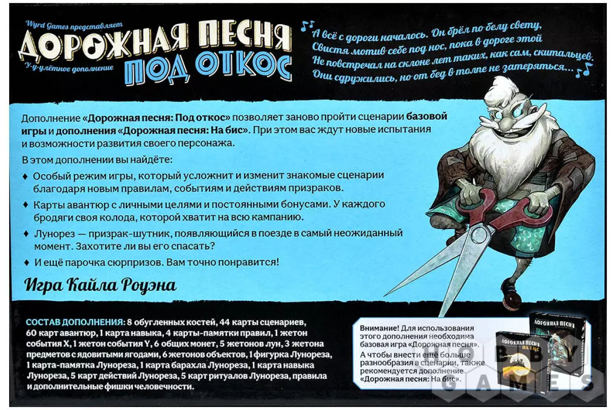 Дополнение "Дорожная песня: Под откос" вносит в знакомые сценарии новые правила, события и коварные действия призраков. Ваших бродяг ждут личные карты авантюр с постоянными бонусами, а в вагонах "Серебряного паромщика" появится загадочный Лунорез – призрак-шутник, чьи визиты могут стать как проклятием, так и спасением. Кампания заиграет новыми красками, будьте готовы к резким поворотам!