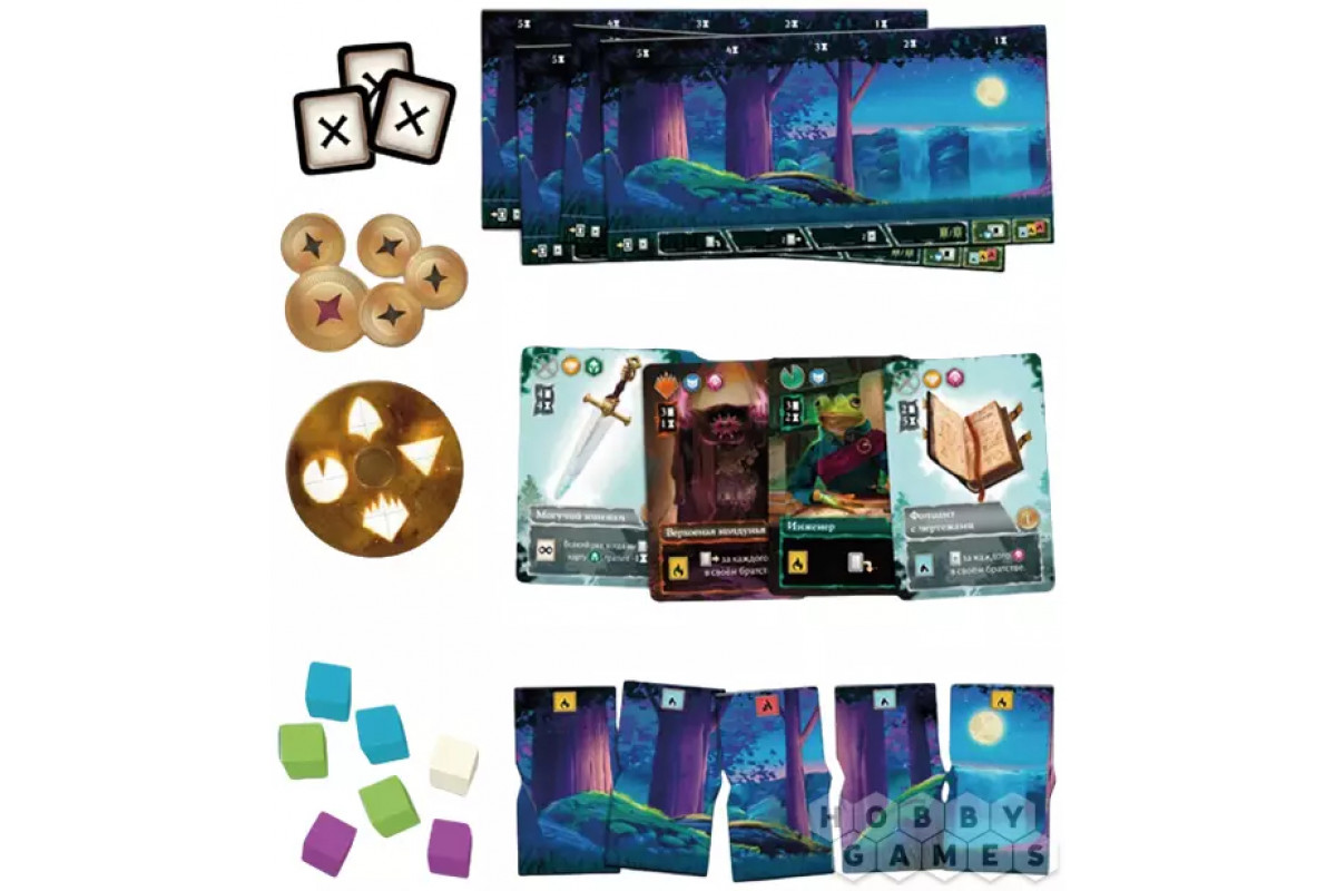 На планшете вы разыгрываете карты, оплачивая их сбросом других. Сдвигающиеся жетоны местности дают временные преимущества. Когда карта уходит с планшета, она вливается в ваше братство, даруя очки, способности и силу атаки для захвата источников.