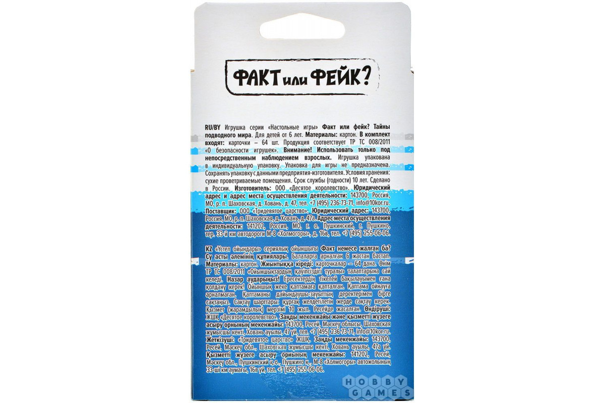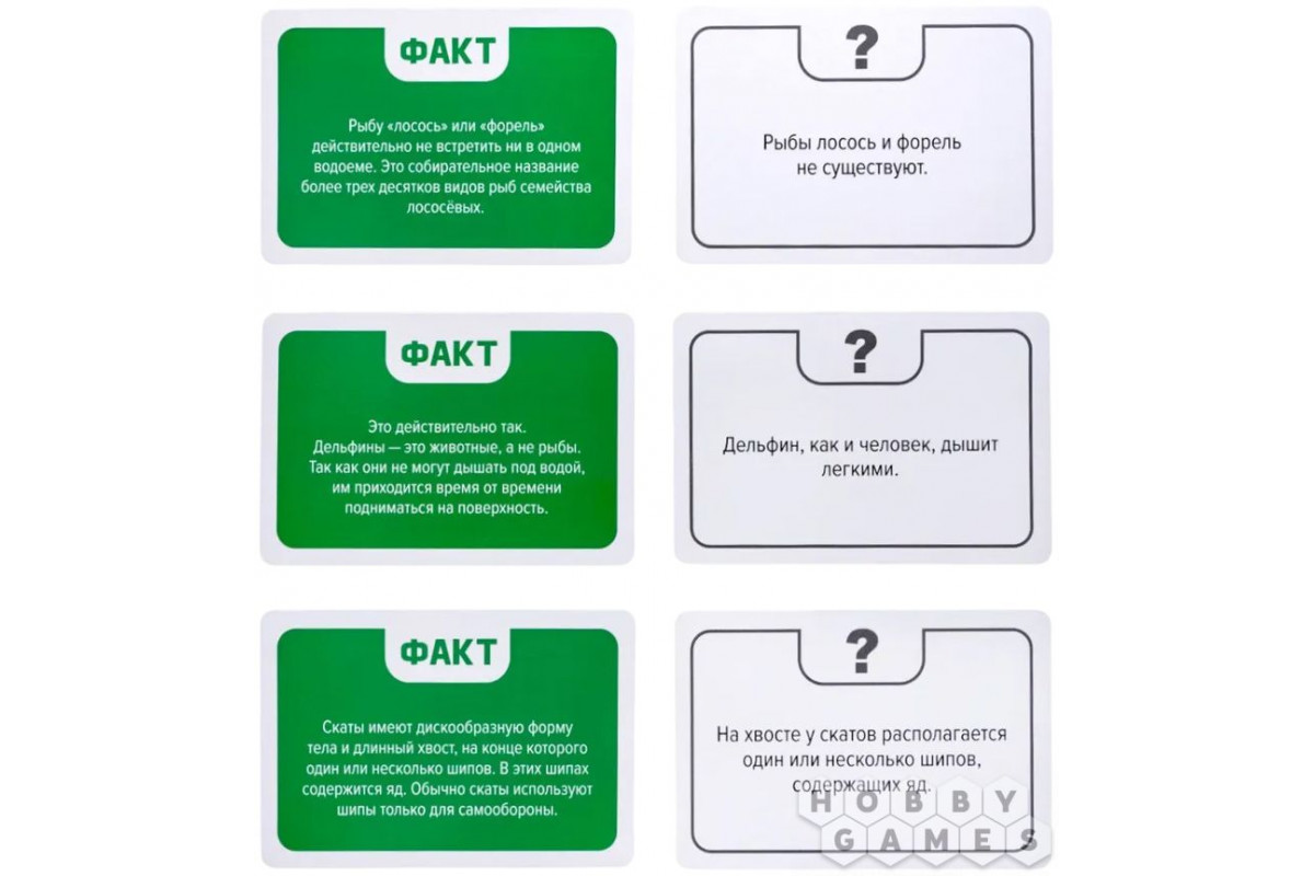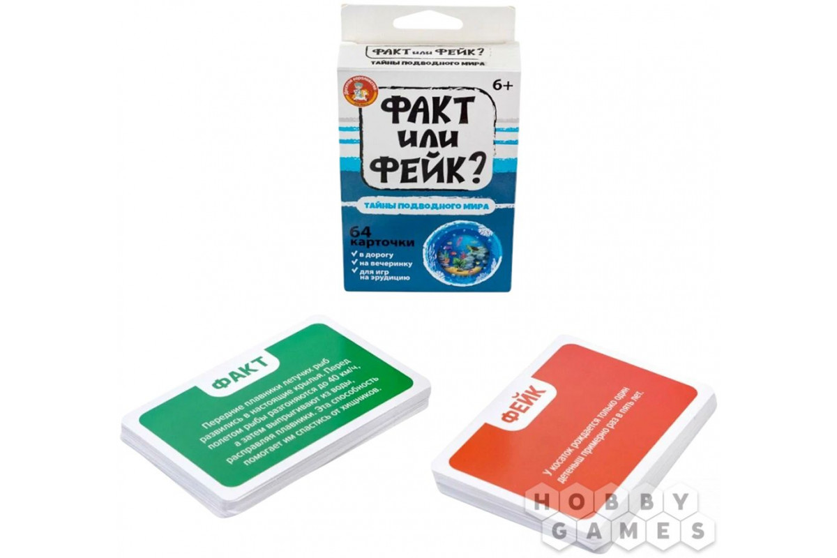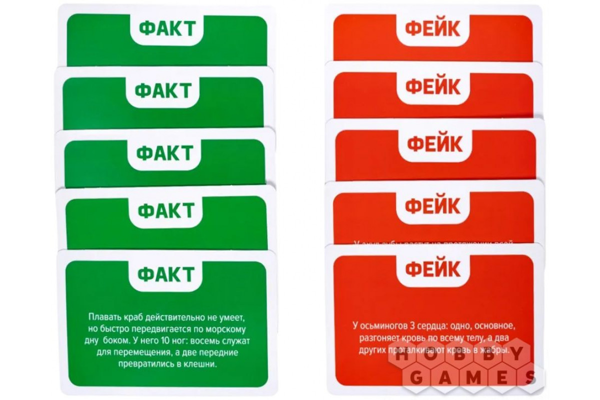 Правила просты: перемешайте колоду карт, положите в центр стола фактами вверх, зачитайте факт на первой карте и ответьте – правда это или фейк. Переверните карту, чтобы проверить свой ответ. Угадали – карта ваша, а если нет, то уберите карту в сторону. Победит игрок, набравший больше всех карт.
