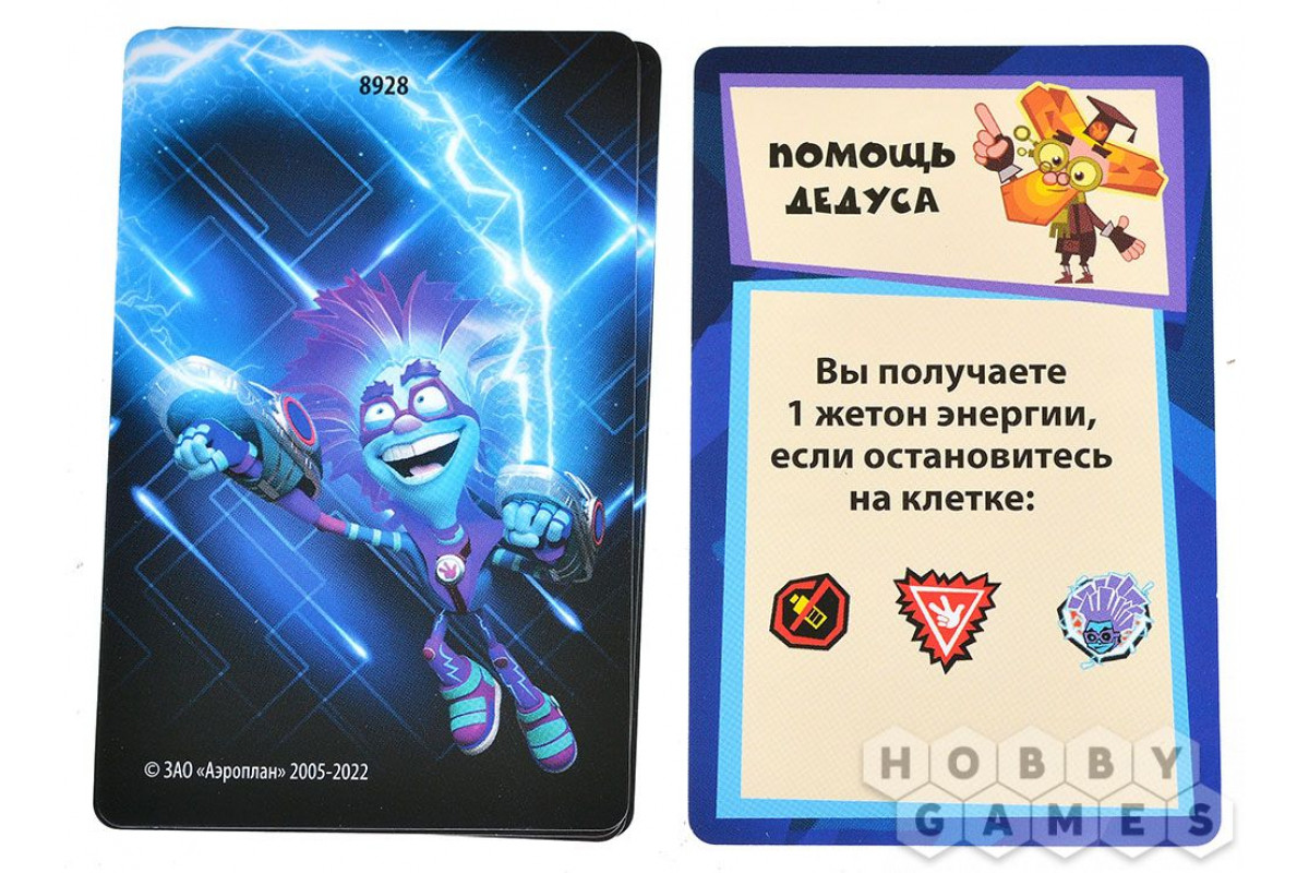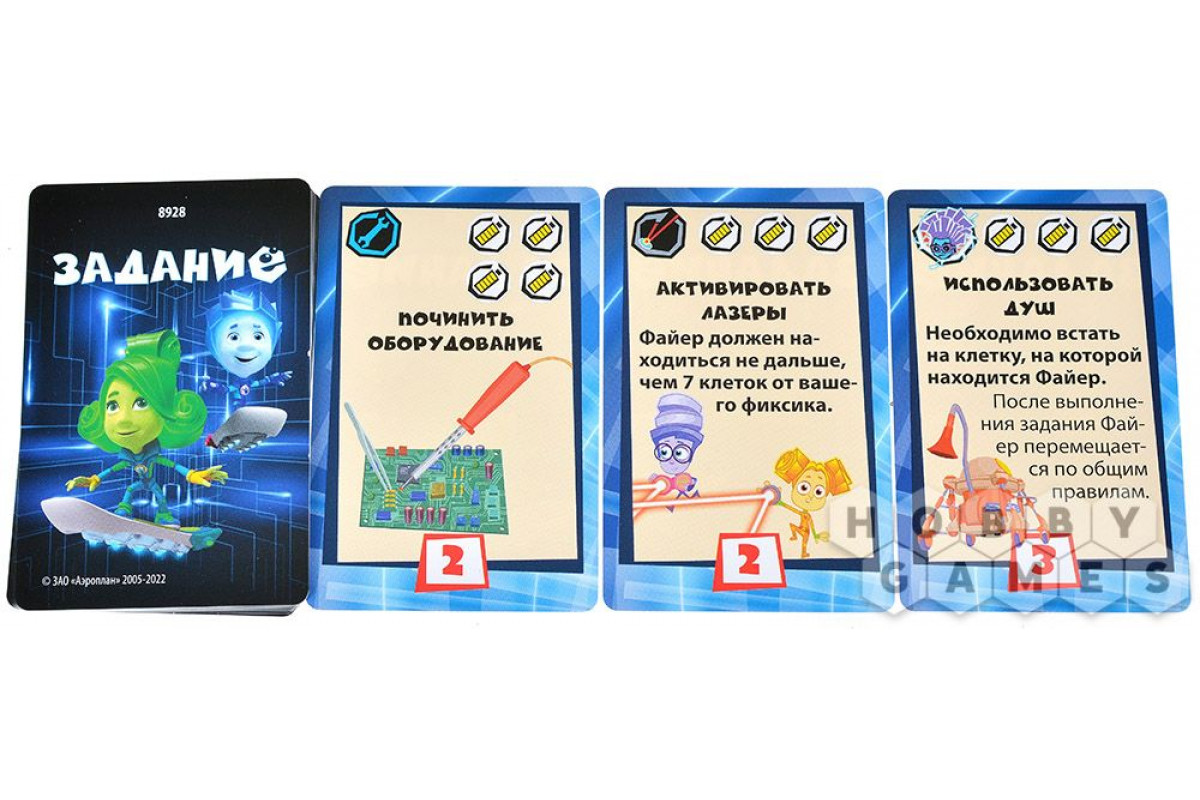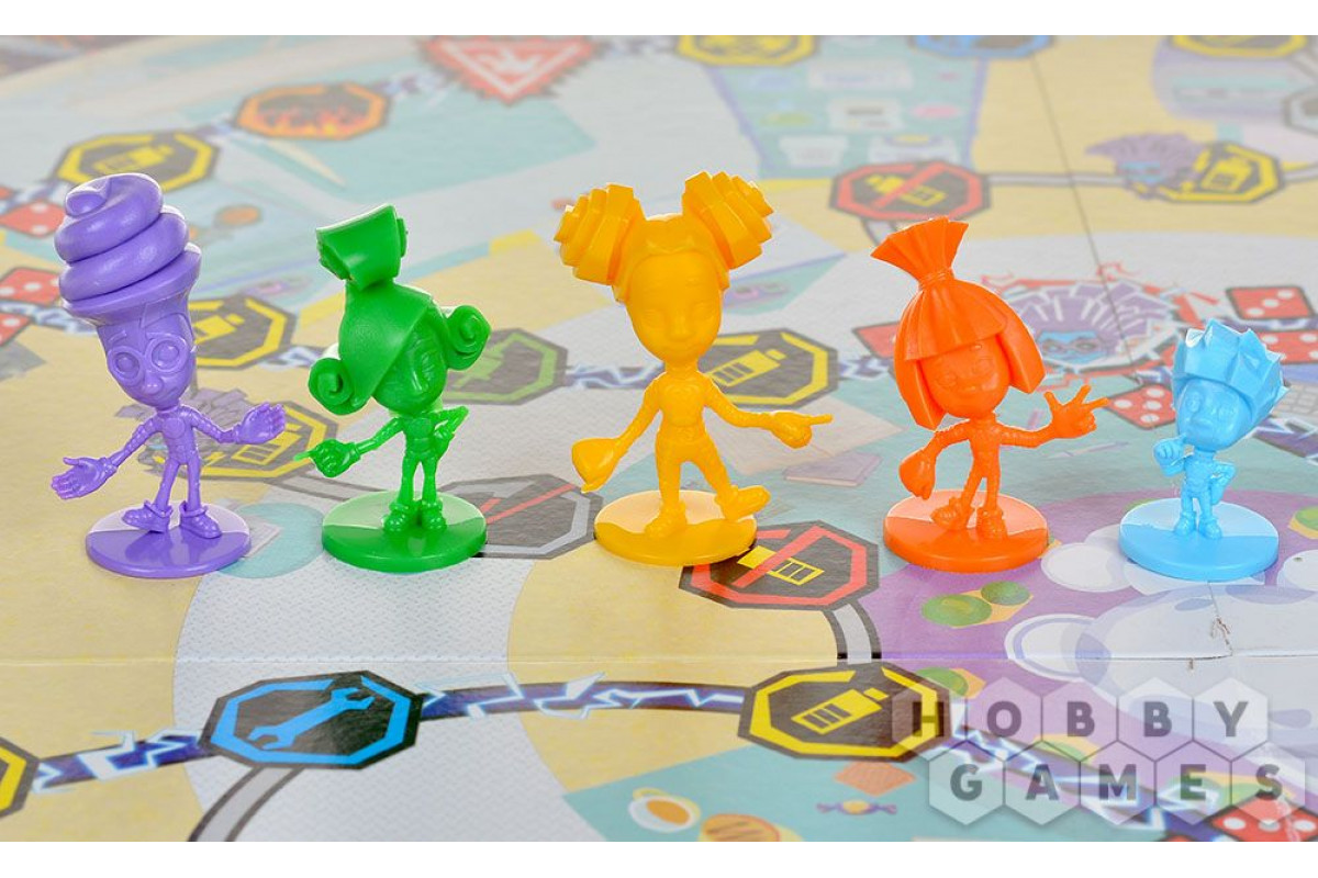 В свой ход вы бросаете кубик и передвигаете своего фиксика по клеткам игрового поля на количество шагов, не превышающее выпавшее число. Фишка всегда должна двигаться вперёд – назад ходить нельзя. Если есть развилка – выберите то направление, которое вам больше по душе. Будьте внимательны: останавливаться на клетке, где уже стоит другой фиксик, нельзя, но можно просто пройти мимо. А вот ячейки, которые на данный момент заняты Файером, становятся недоступны как для прохода, так и для остановки. В зависимости от клетки, на которой вы остановитесь, могут произойти разные события: вы можете получить жетоны энергии, потерять их и так далее.