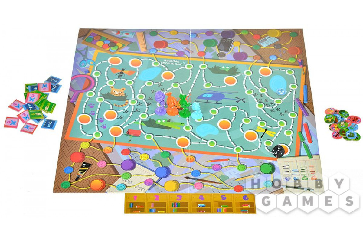 В настольной игре "Фиксики: Лесные тропинки" вы возьмёте на себя роль фиксиков – любопытных исследователей леса. Вам с героями предстоит передвигаться по красочному игровому полю, бросая кубик и собирая жетоны знаний, которые помогут изучать удивительные находки леса. В игре есть разные варианты игрового поля, которые зависят от количества игроков – от компактного поля для двоих до полного лесного пространства для компании из четырёх человек. В "Лесных тропинках" гармонично сочетаются простые правила с увлекательной тактикой, что делает её интересной и детям, и взрослым!
