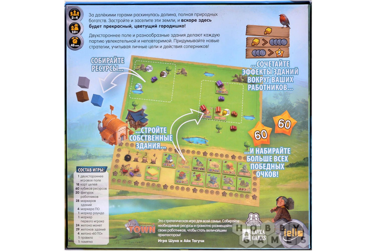 "Городишко. Little Town" – это несложная, но глубокая стратегия о ремесле строителей и архитекторов. Чтобы достичь успеха, необходимо грамотно распределять имеющиеся ресурсы и строить город так, чтобы максимизировать выгоду. Вы будете размещать жетоны построек и активировать их при помощи рабочих. Рабочие дают вам полезные эффекты в зависимости от того, какие постройки находятся вокруг них – и при этом постройки не обязательно должны быть сооружены вами! Вы вправе пользоваться зданиями оппонентов – только вот за это придётся уплатить немного монет. Только будьте внимательны: в конце игры монеты принесут очки, необходимые для победы!