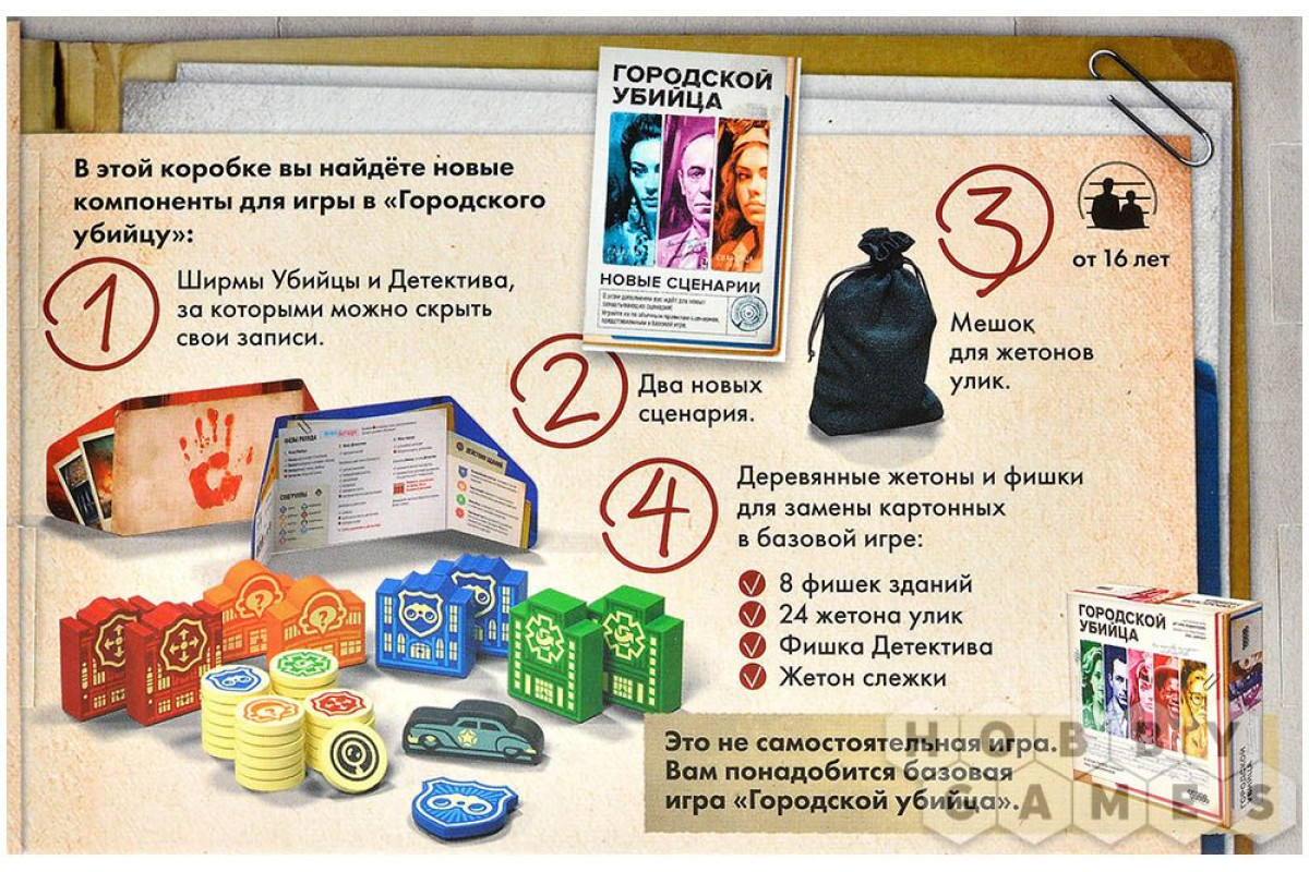В этом наборе для игры "Городской убийца" заключены не только новые компоненты, но и захватывающая атмосфера, в которой можно почувствовать себя в центре запутанного расследования. Ширмы Убийцы и Детектива позволят скрыть свои записи, оставляя противника в неведении о ваших намерениях. Два новых сценария вводят неожиданные повороты, обостряя напряжение и заставляя принимать стратегические решения, которые могут кардинально изменить ход игры. Мешок для жетонов улик добавляет элемент неопределённости и случайности, а деревянные жетоны и фишки заменяют картонные компоненты, придавая игре более ощутимый и реалистичный вид.