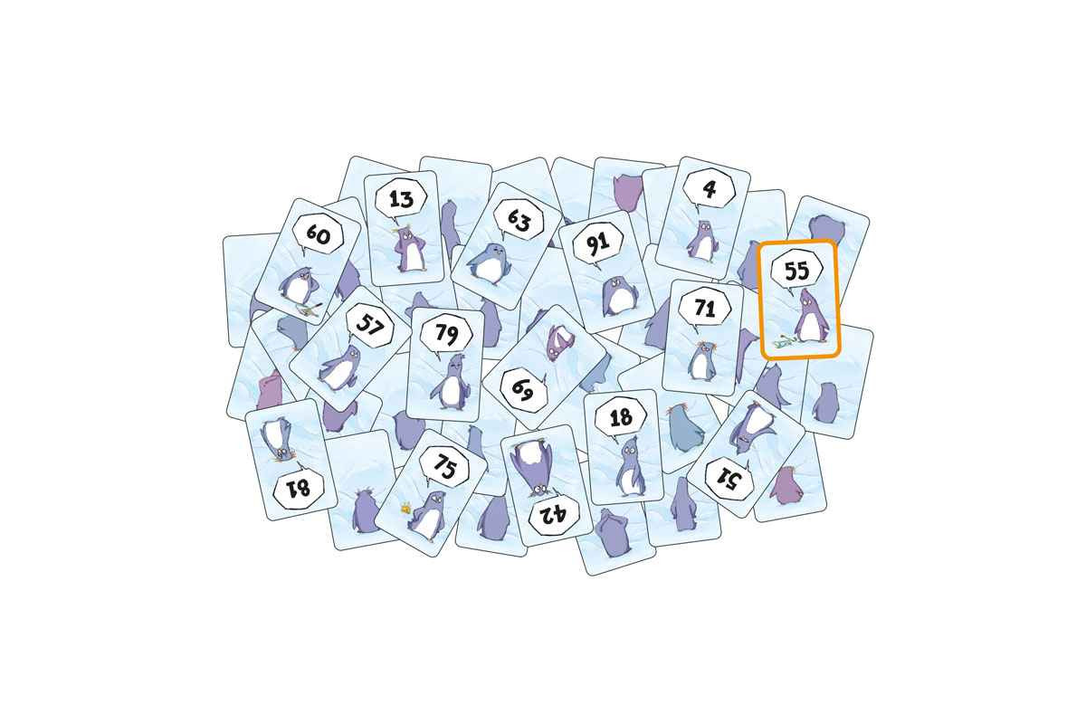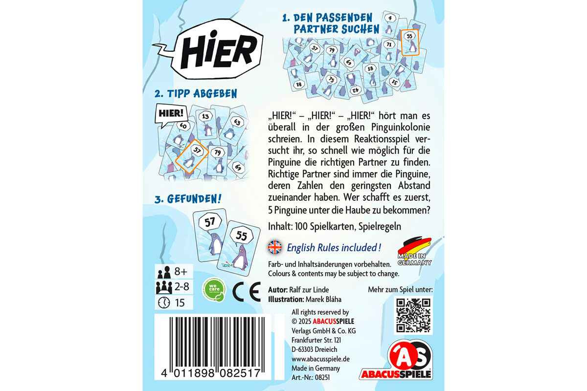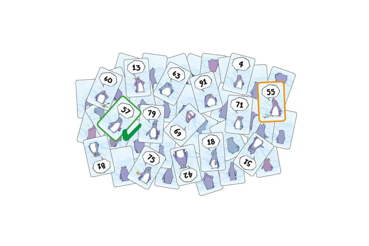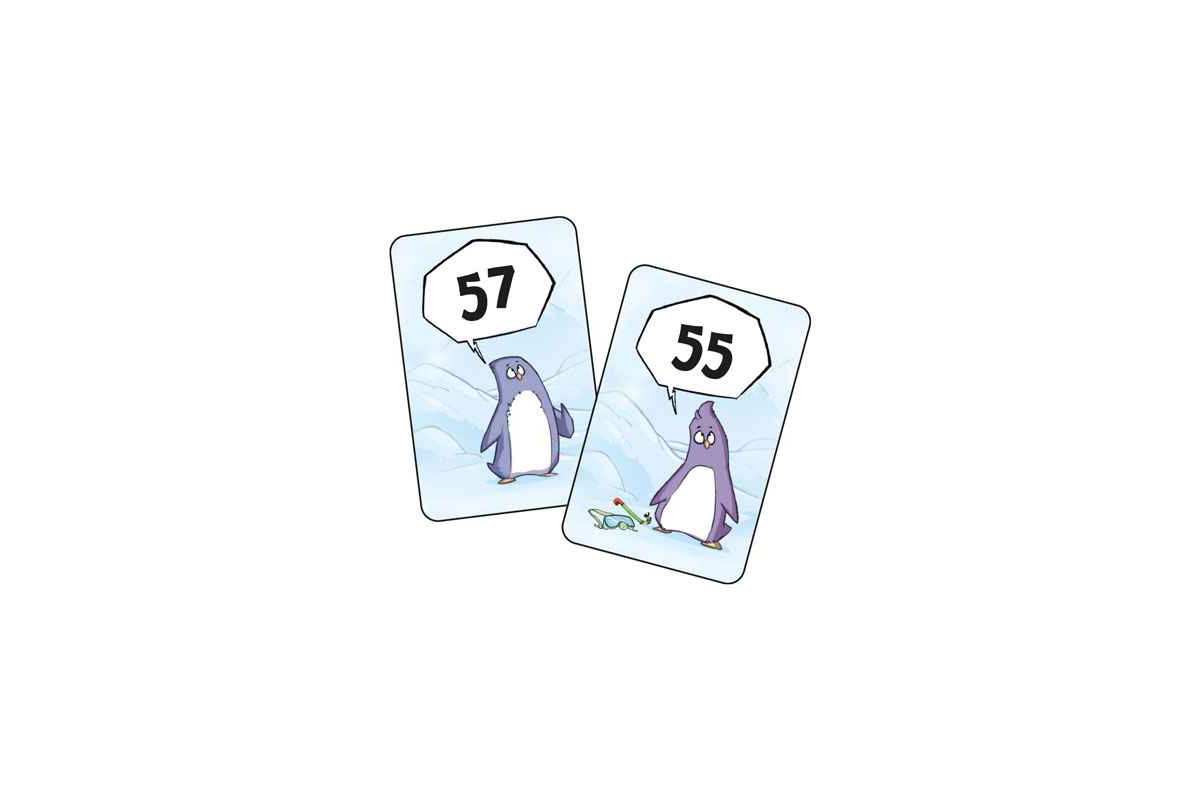 „HIER!“ – „HIER!“ – „HIER!“ hört man es überall in der großen Pinguinkolonie schreien. In diesem Reaktionsspiel versucht ihr, so schnell wie möglich für die Pinguine die richtigen Partner zu finden. Richtige Partner sind immer die Pinguine,deren Zahlen den geringsten Abstand zueinander haben. Wer schafft es zuerst, 5 Pinguine unter die Haube zu bekommen?