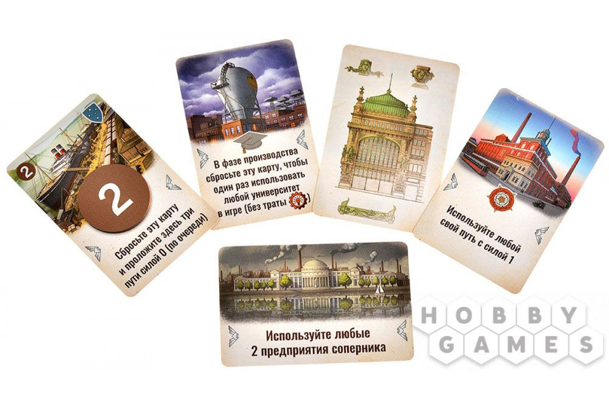 В правилах игры вы также найдёте вариации, призванные усложнить процесс для более опытных игроков. Кроме того, стоит отметить красочные иллюстрации на картах предприятий. Для многих из них основой стали изображения реальных промышленных комплексов рубежа XIX–XX веков. Они стали архитектурным гимном эпохи инженеров и предпринимателей, пара и электричества, первых автомобилей и трансконтинентальных железных дорог.