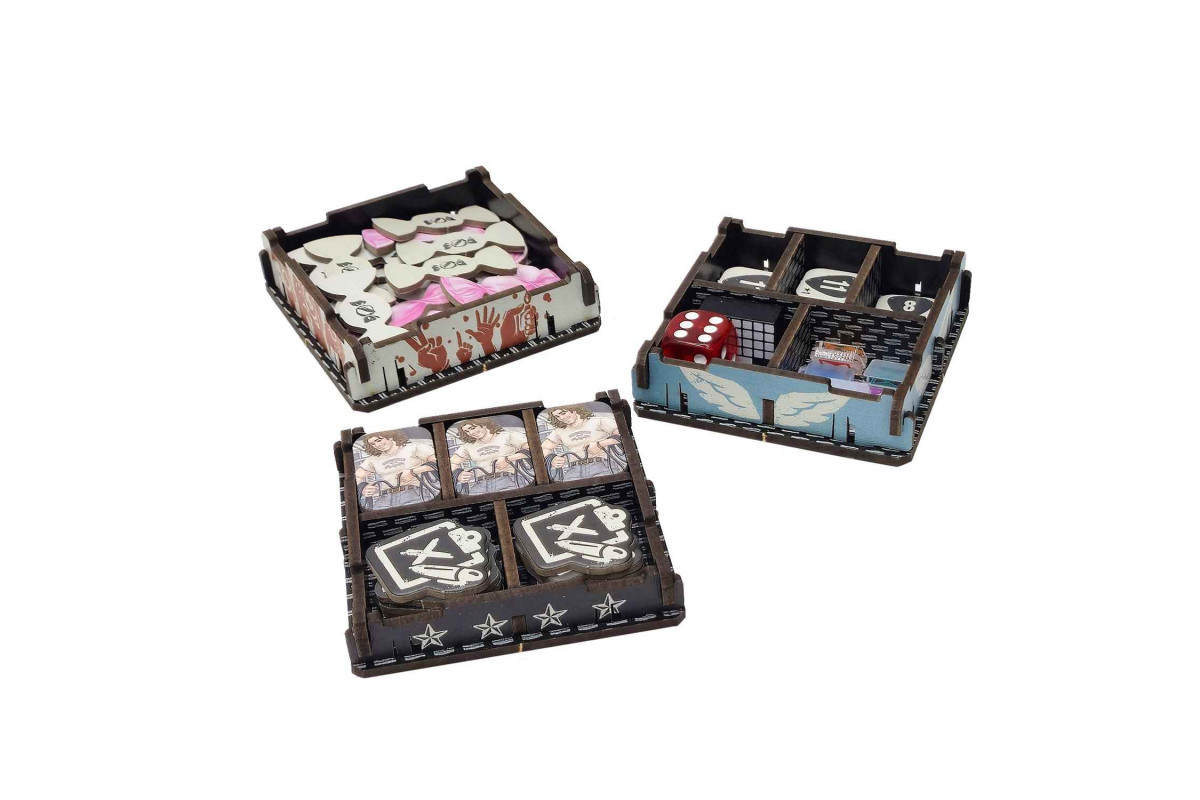 Full-color UV printing ties the trays thematically to the game