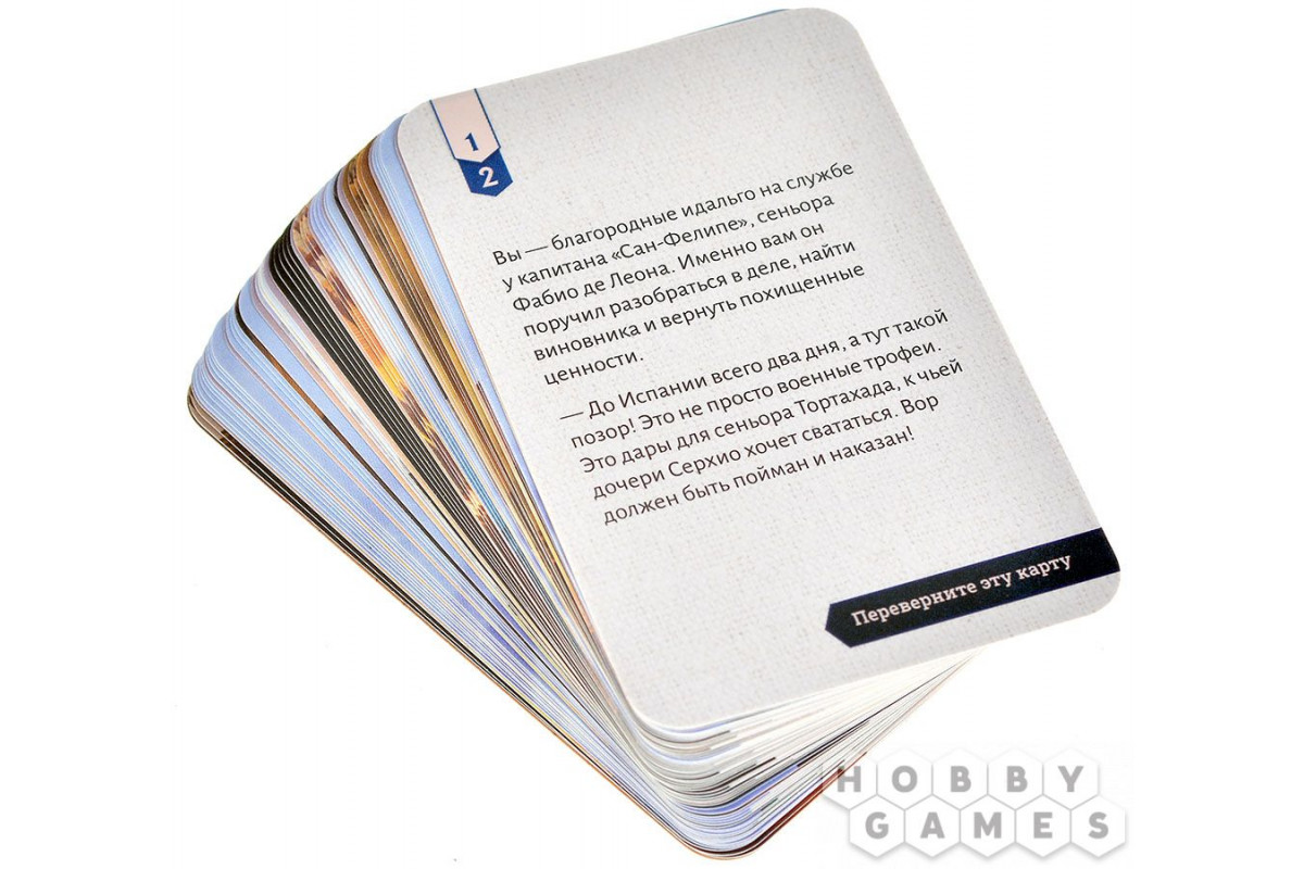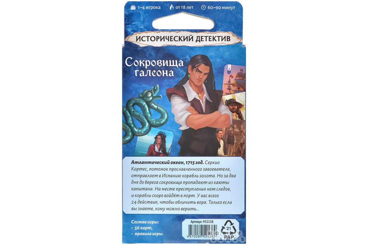"Сокровища галеона" – настольный детектив с атмосферой исторического приключения, где вы расследуете кражу на борту испанского галеона. Игра рассчитана на компанию от одного до четырёх игроков. В вашем распоряжении тринадцать колод карт, каждая из которых раскрывает новые улики, диалоги с персонажами и детали обстановки. Уникальность игры – в её визуальной составляющей: иллюстрации полны скрытых подсказок, а эмоции персонажей помогают понять, кто лжёт. Механика действий добавляет напряжённости – каждое решение должно быть взвешенным. Вы будете разгадывать тайну, переворачивая карты, но будьте внимательны: некоторые из них требуют затраты действий, а другие открываются бесплатно. В конце игры вас ждёт финальный тест – сканирование QR-кода с вопросами, где вы проверите свою интуицию и логику.