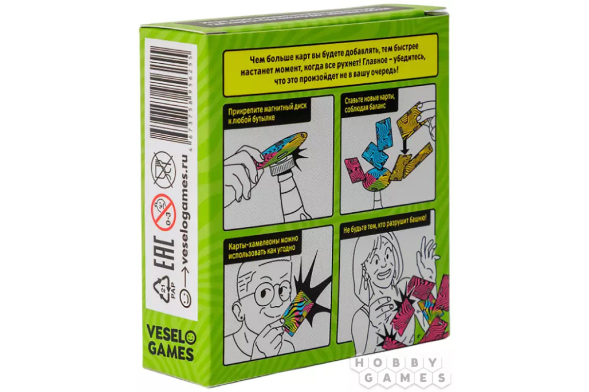 Игроки по очереди берут карту из колоды и аккуратно цепляют её к башне так, чтобы цвет карты совпал с цветом места крепления. С каждым ходом конструкция начинает раскачиваться, а азарт растёт вместе с высотой башни.