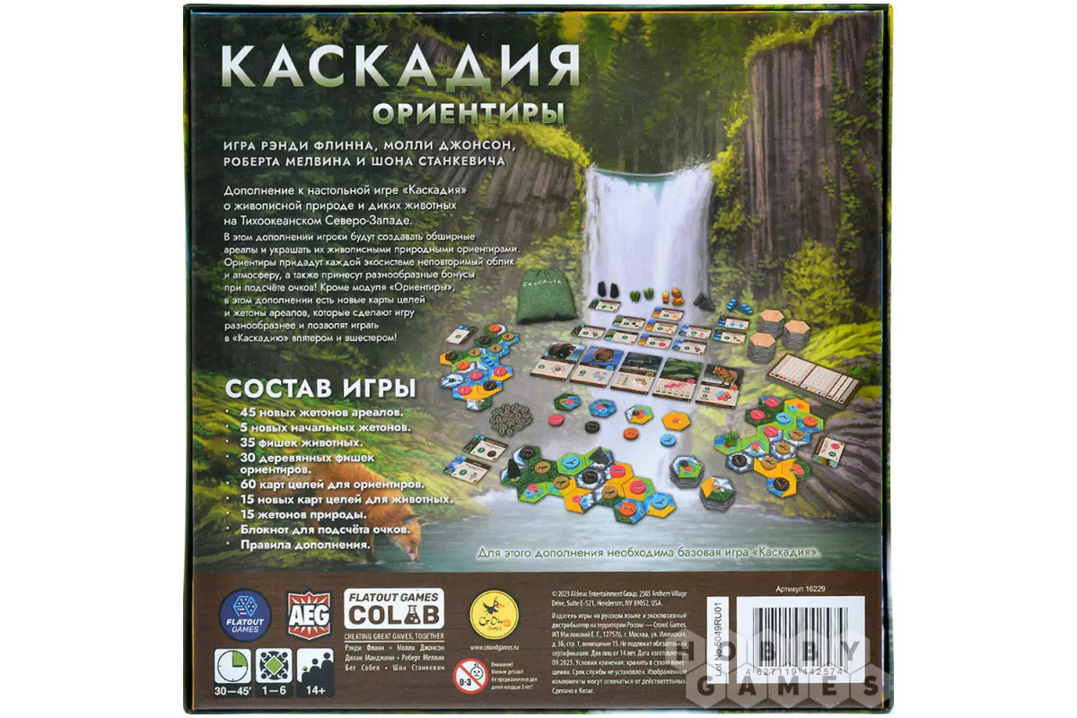 "Каскадия: Ориентиры" – это дополнение к семейной стратегический игре "Каскадия", которое сделает игровой процесс ещё интереснее и увеличит количество тактических возможностей. Теперь игроки смогут оживить свои ареалы, наполнив их впечатляющими природными достопримечательностями. Размещая водопады, гигантские деревья и другие живописные объекты, вы не только придадите своим экосистемам уникальный облик, но и получите ценные бонусы в конце игры. А ещё теперь у вас появится прекрасная возможность сыграть в эту настолку компанией до шести человек, и всё благодаря дополнительному набору компонентов – жетонов ареалов и фишек животных! Скорее раскройте новые грани этой удивительной игры!