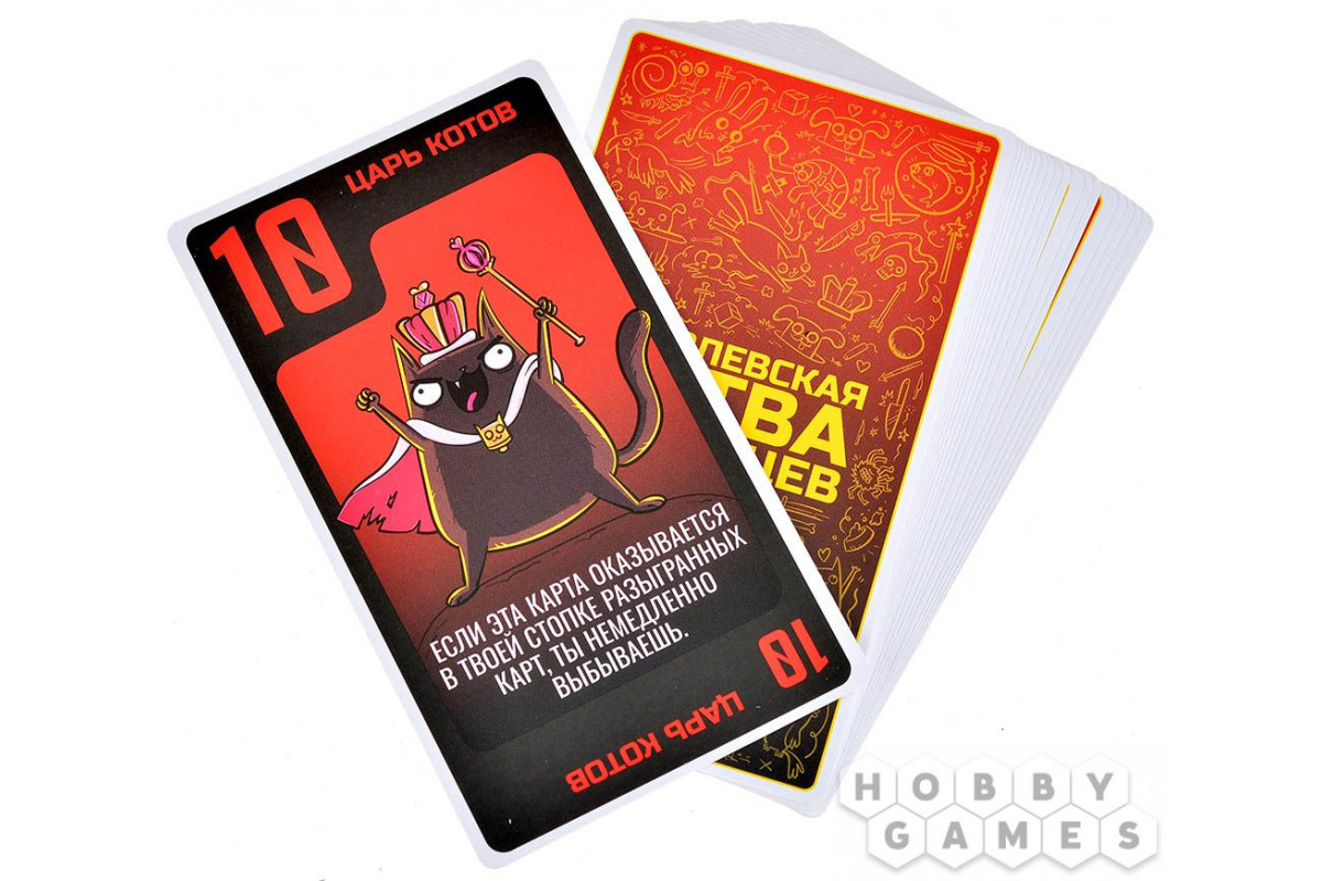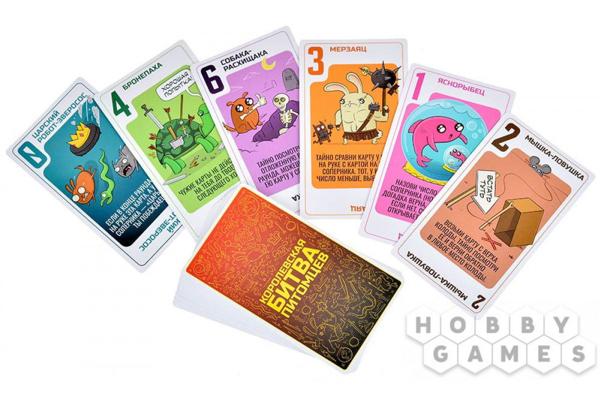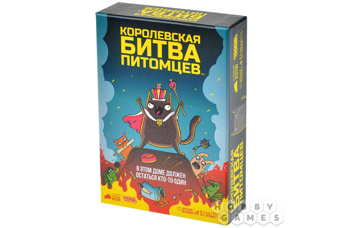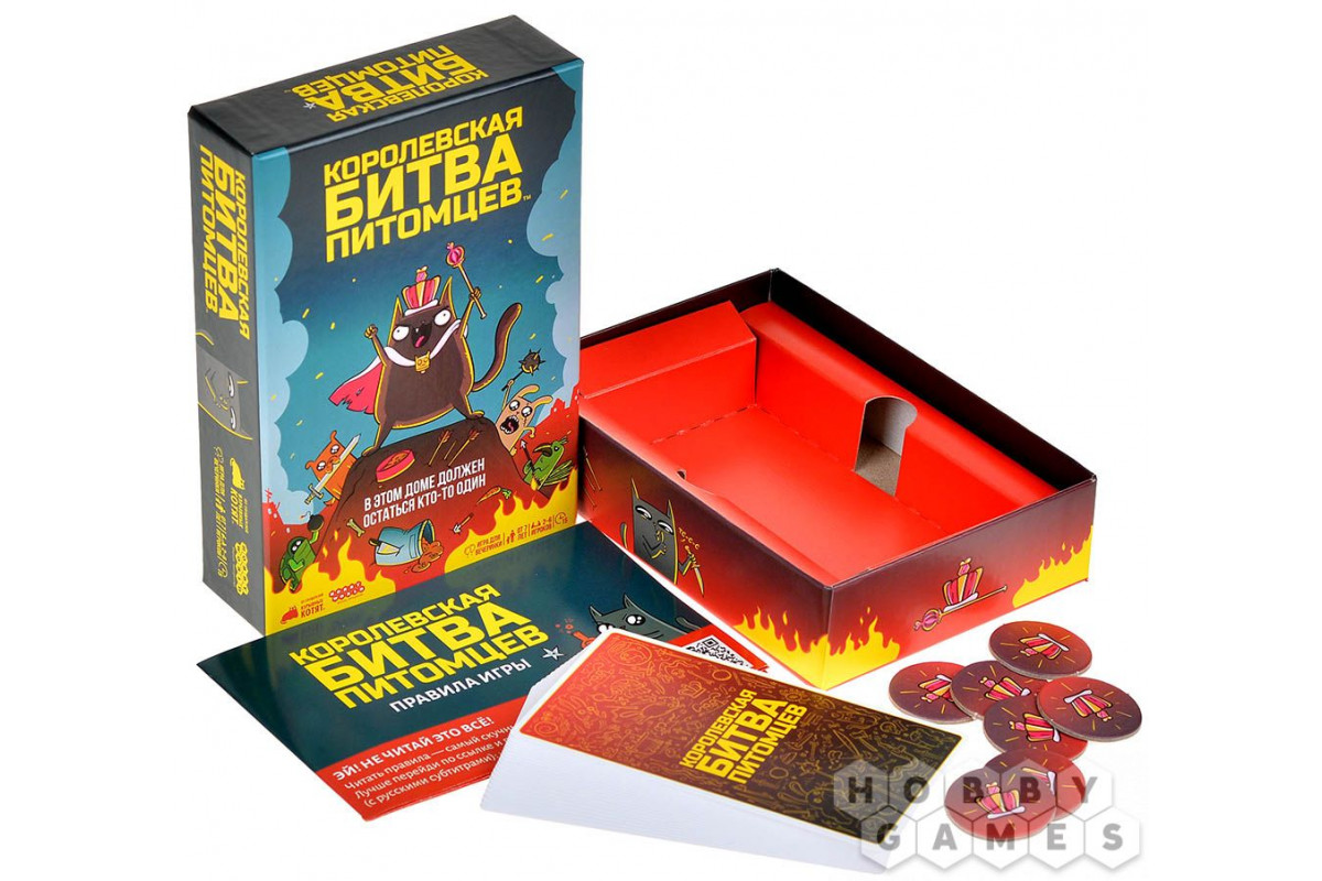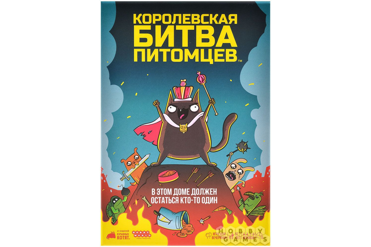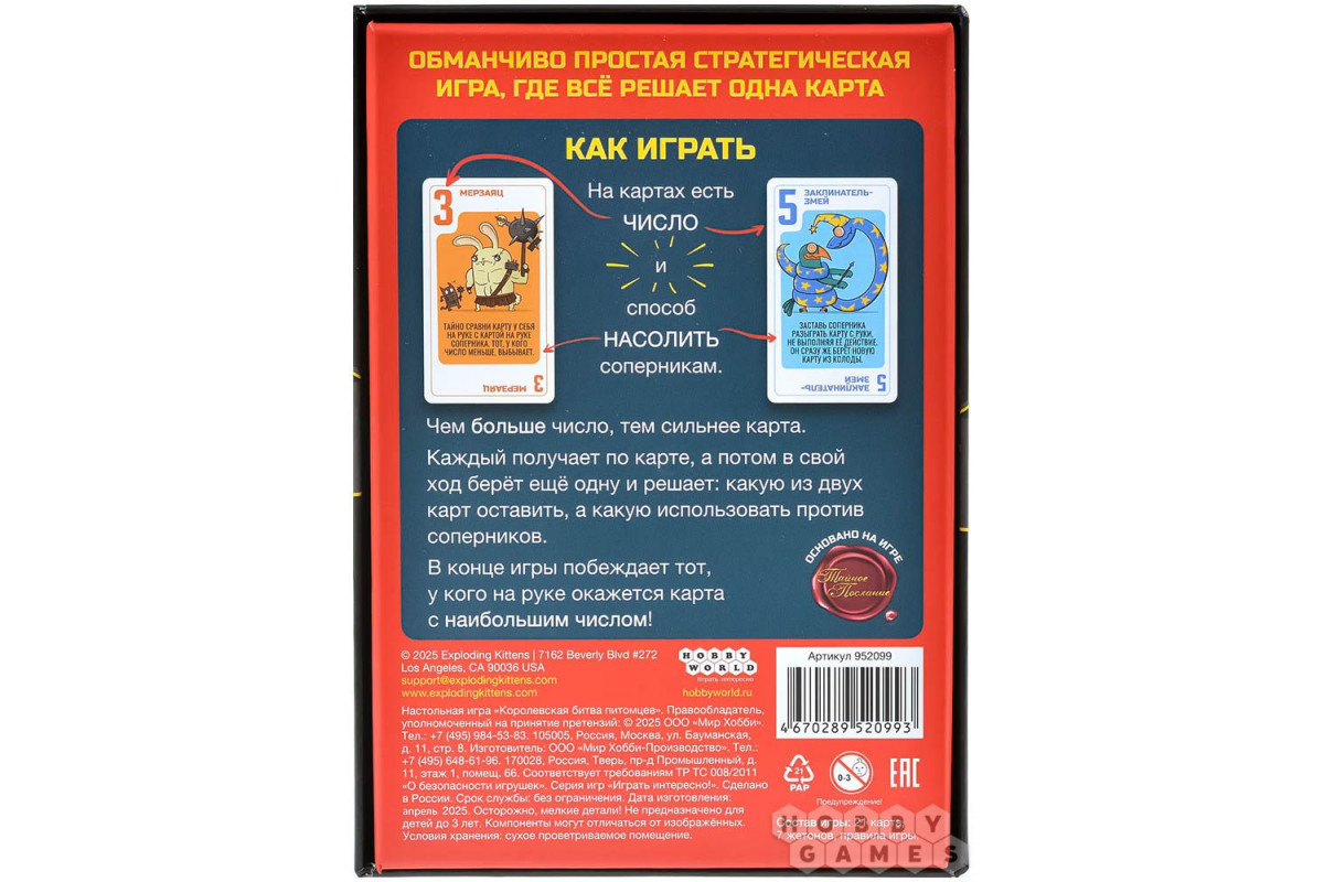 "Королевская битва питомцев" – это весёлая вечериночная игра от создателей знаменитых и любимых множеством "Взрывных котят". Здесь каждый раунд превращается в стремительное столкновение чисел и коварных способностей. Всё начинается с одной карты и одной же картой заканчивается – и лучше бы у неё было самое большое число среди всех собравшихся за столом! Ведь если бы хотите победить, не нужно быть гением: ваша карта просто должна побить все остальные. В чём сложность (и самое веселье)? В том, что лишние карты вы будете разыгрывать! Выбивать соперников из игры, красть карты, устраивать хаос на поле – или, наоборот, защищаться от нападок. Звучит легко, да? На словах-то всё понятно, вот только соперники тоже не дремлют и только и ждут, как бы устроить вам какую-нибудь карточную гадость...