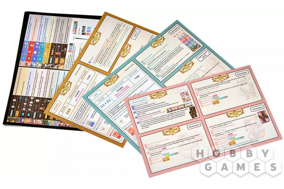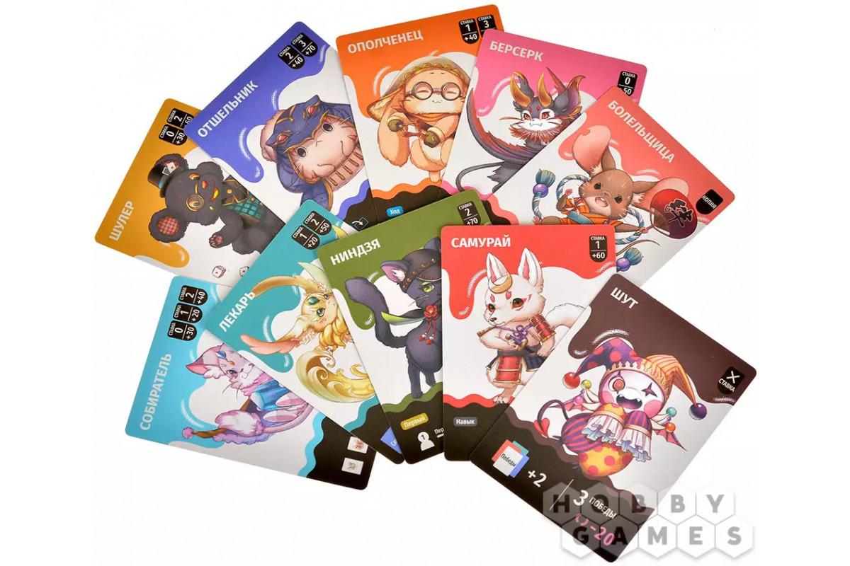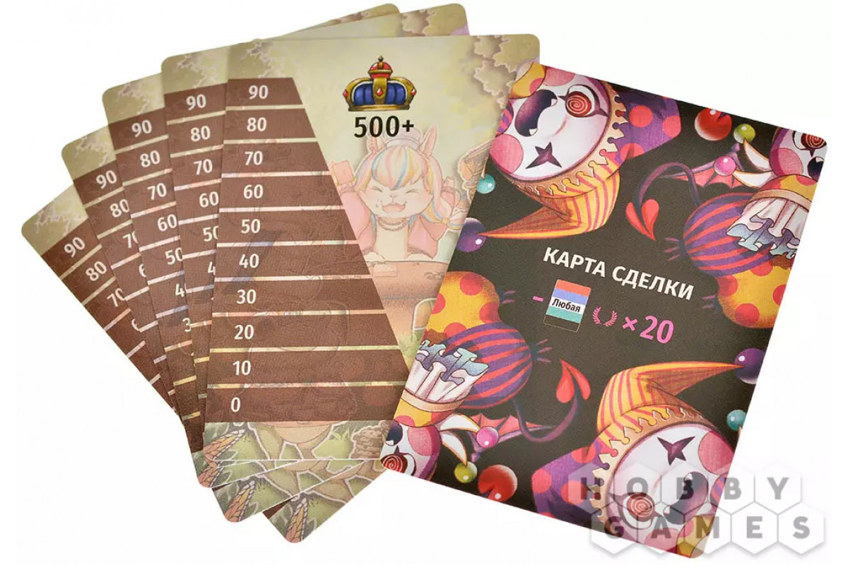 После этого начинается самая напряжённая часть игры. Игроки по очереди выкладывают по одной карте с руки, соблюдая правило зависимости по цвету. Каждый кон заканчивается взяткой, и её забирает игрок с самой сильной картой. Он же становится первым игроком следующего кона, получая важное преимущество. Когда сыграны все пять конов, игроки подсчитывают победные очки – за успешные ставки, количество побед, свойства персонажей и карты, выигранные во взятках.