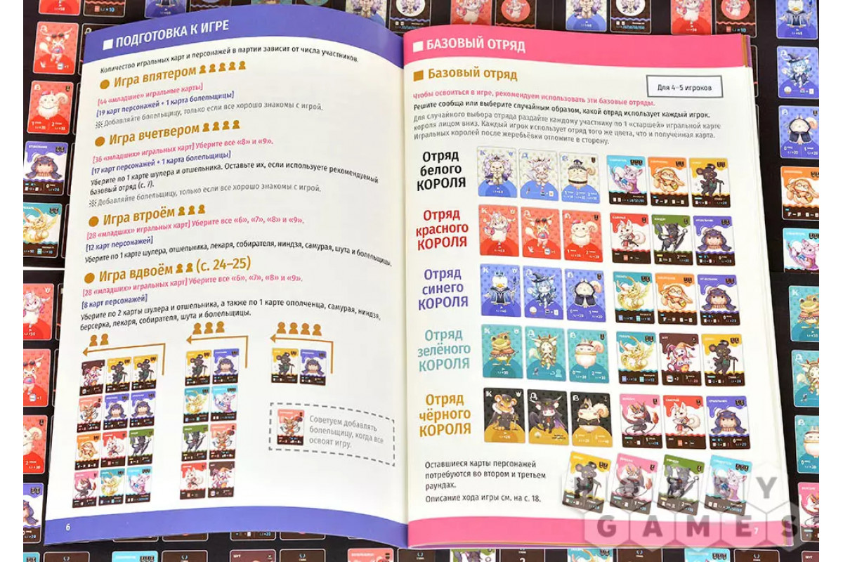 В начале раунда каждый игрок получает на руку 5 игральных карт – именно столько конов предстоит разыграть. Затем приходит время собрать свой отряд: вы выбираете один набор правителей – короля, даму и валета одного цвета – и трёх персонажей, которые будут сопровождать вас в этом раунде. Во втором и третьем раундах правила становятся строже – тех же персонажей, что были у вас раньше, взять уже нельзя, и приходится искать новые комбинации.