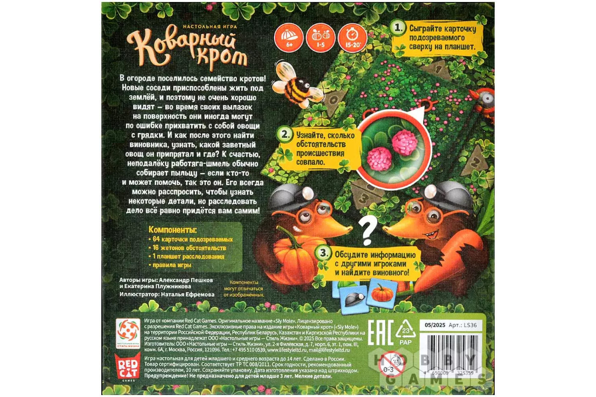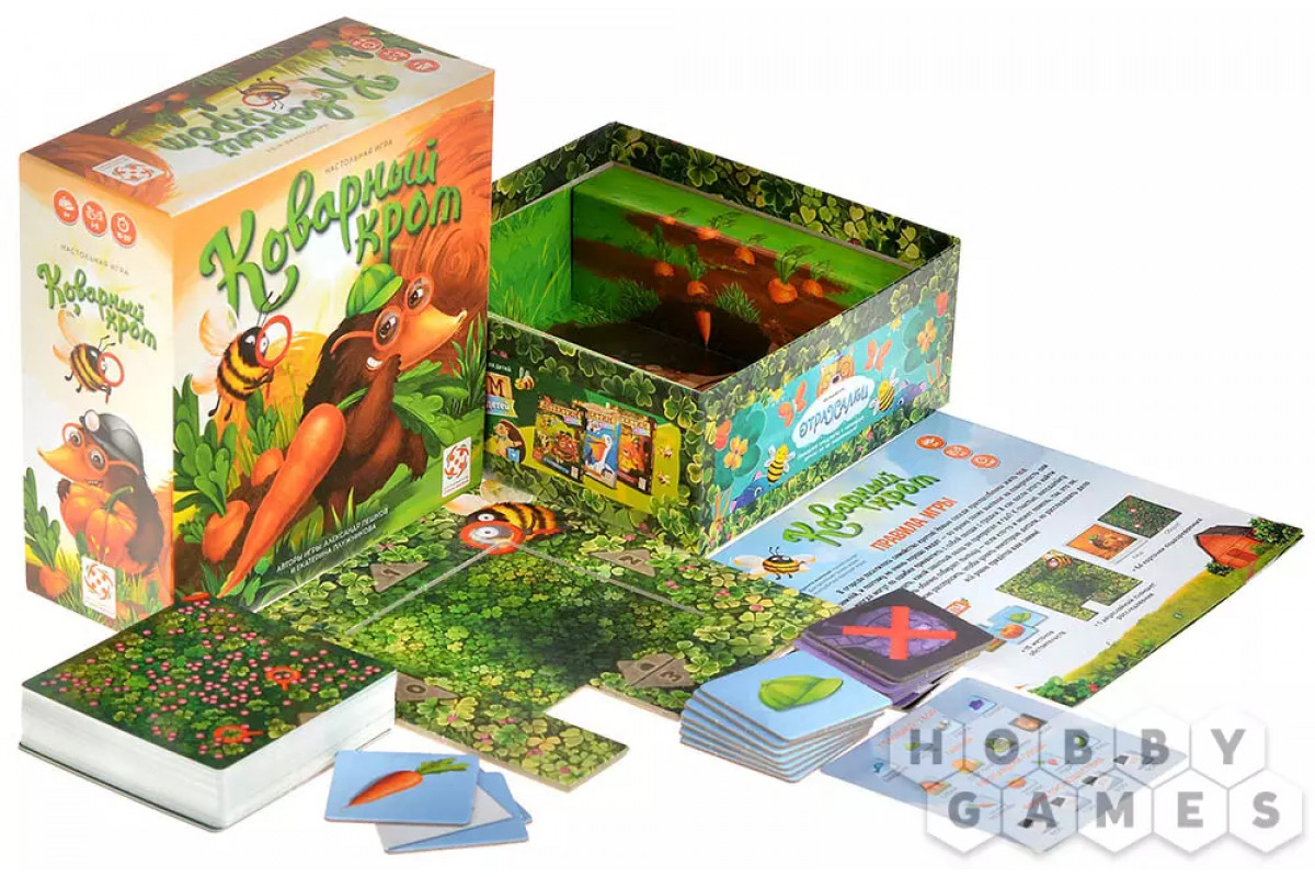 "Коварный крот" – это настольная игра для самых проницательных садоводов! Вам предстоит расследовать загадочные пропажи овощей с грядок. Ваша цель – вычислить, какой именно овощ он припрятал в этот раз. И в какой из своих многочисленных норок его спрятал! Главной особенностью игры является детективный геймплей, построенный на дедукции и внимании. Яркое игровое поле и очаровательные компоненты создают тёплую и уютную атмосферу, которая понравится и детям, и взрослым. Это идеальный способ весело и с пользой провести время в кругу семьи или друзей, развивая логическое мышление.