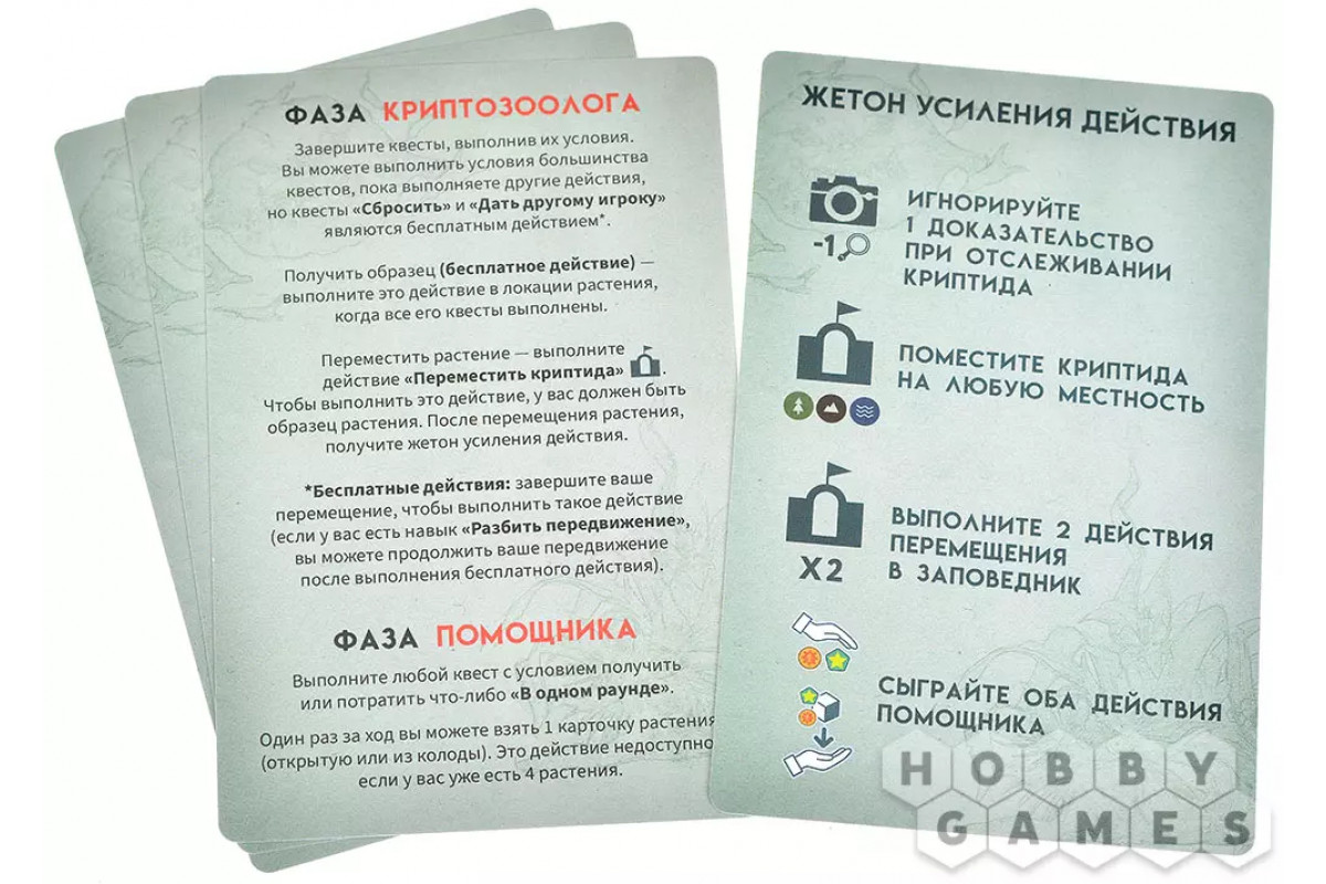 - Выбираете одно из ключевых действий: собрать доказательство, выследить криптида (если на нём ваш жетон ставки), переместить его в заповедник или обновить информацию на поле.