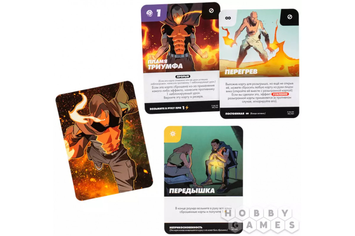 Сила проверенной системы "Карманного поединка" обретает новую мощь. Цель неизменна: первым свести здоровье соперника с 10 до нуля или нанести сокрушительный решающий удар. В каждом раунде игроки тайно выбирают и одновременно вскрывают карты, где интеллект побеждает силу, сила – ловкость, а ловкость – интеллект. Неотменённые карты наносят урон, который может быть заблокирован защитой. После фазы эффектов сыгранные карты уходят в сброс, и их возвращение через "передышку" становится самым рискованным моментом партии – отдых может быть мгновенно прерван победным ударом противника!