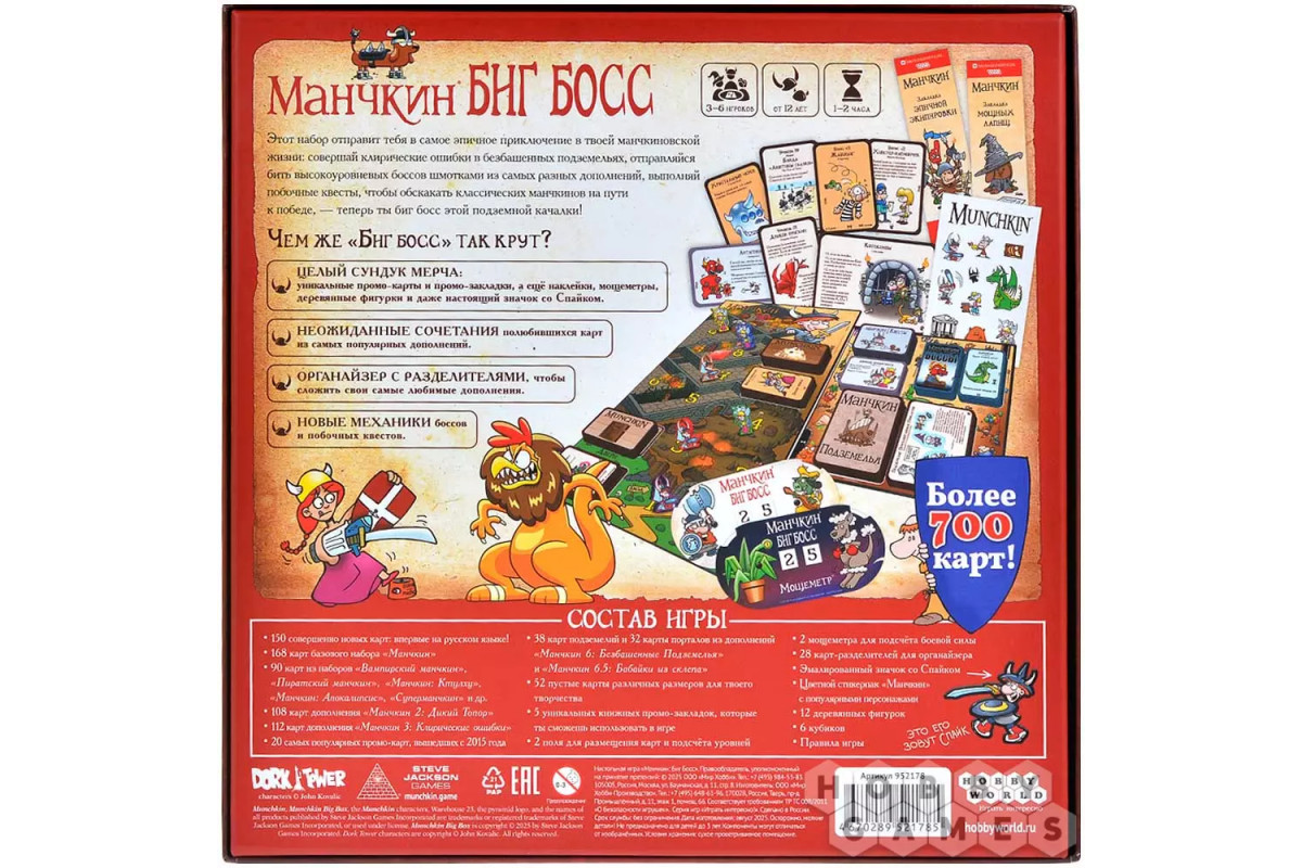 "Манчкин: Биг Босс" – это грандиозный набор, который отправит вас в самое масштабное приключение в вашей манчкиновской жизни. Он объединяет лучшие карты из самых популярных дополнений, создавая неожиданные и взрывные комбинации, которые вы ещё не испытывали. Теперь ваш путь к победе станет ещё более непредсказуемым!