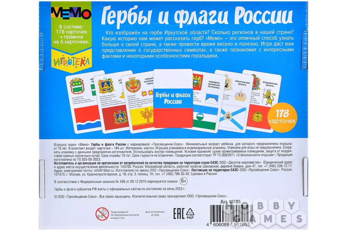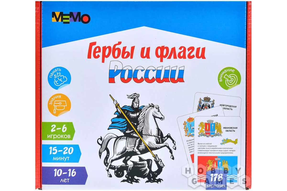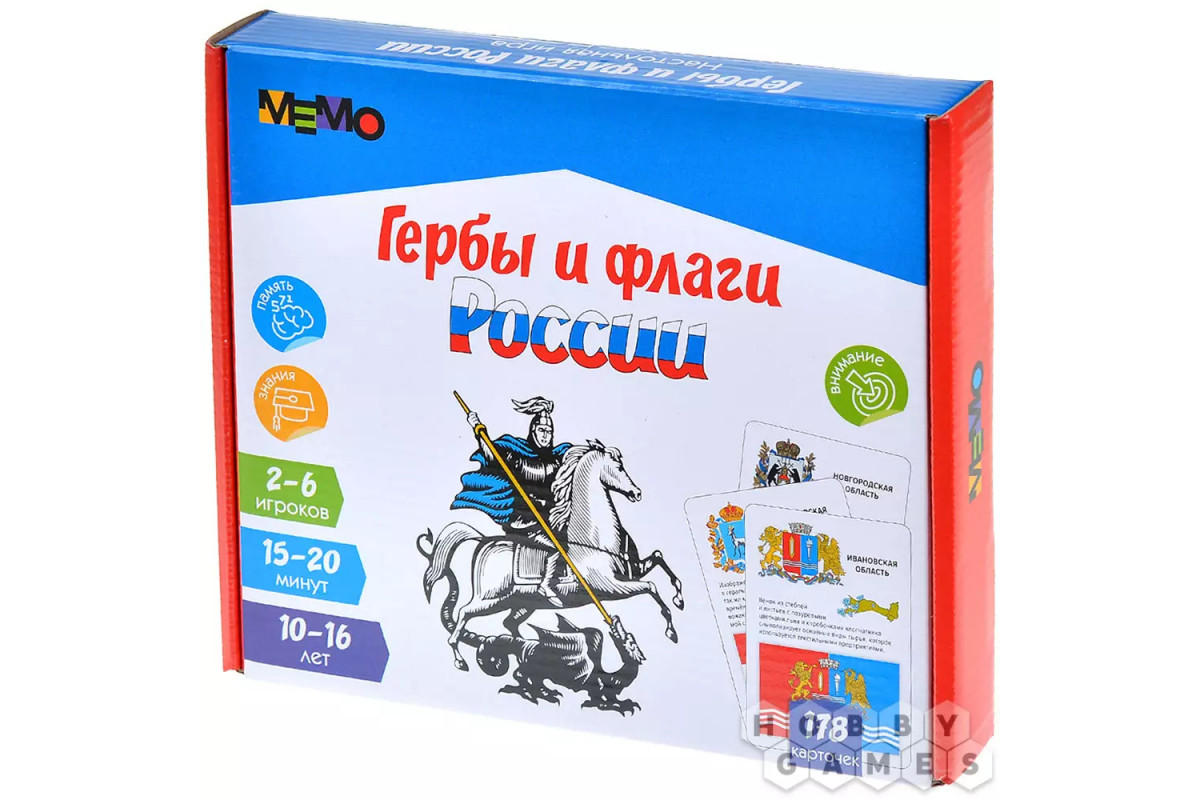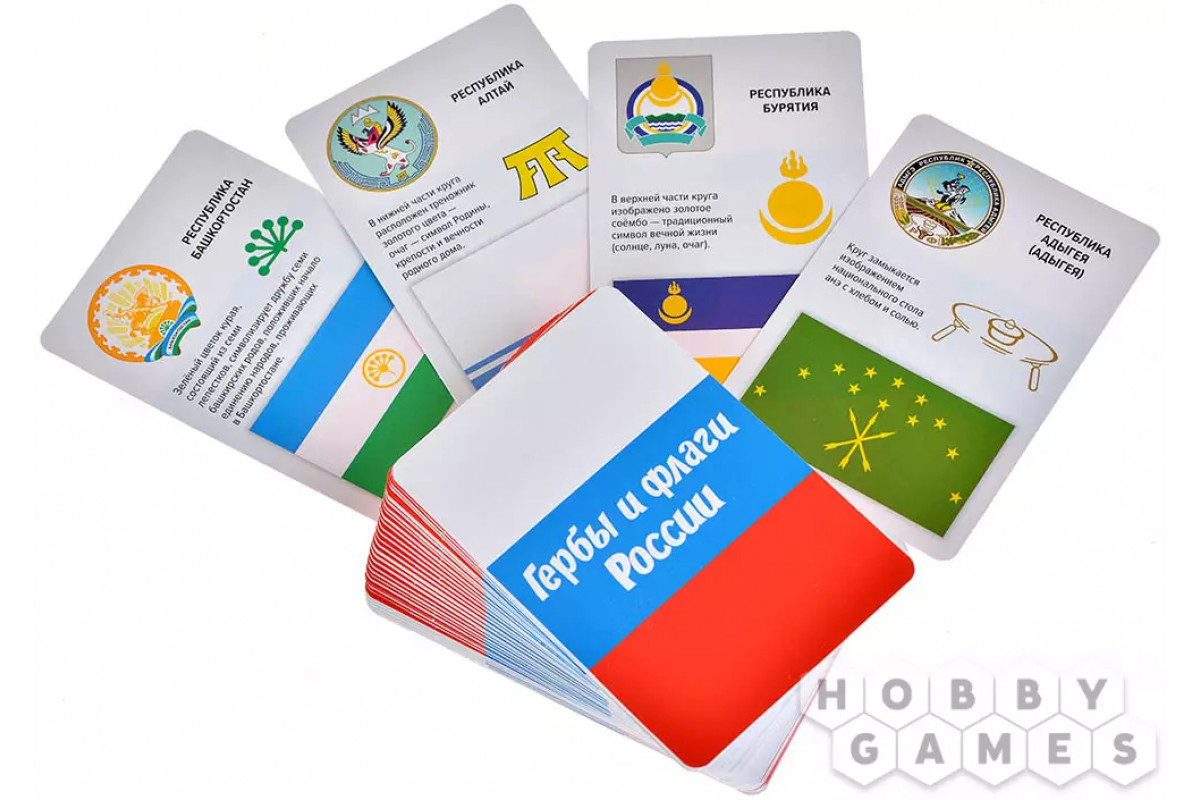 Внутри коробки вы обнаружите больше сотни карточек, на которых представлены гербы и флаги всех уголков нашей страны, а также любопытные факты о каждом из них. Каждая карточка подробно разбирает отдельный геральдический элемент, объясняя его значение и происхождение. Постепенно, шаг за шагом, складывается общая картина: вы начинаете понимать, что лишь сочетание всех деталей и цветовой палитры раскрывает подлинную историю и характер региона.