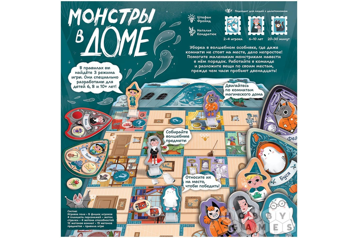 "Монстры в доме" разработаны специально для детей: вы найдёте три отдельных режима игры, адаптированных под разный возраст, что позволит всей семье постепенно осваивать правила и получать наслаждение от процесса. Игра не только подарит массу положительных эмоций, но и научит детей действовать сообща, развивая стратегическое мышление и внимательность. А красочное оформление сделает каждую партию незабываемым приключением!