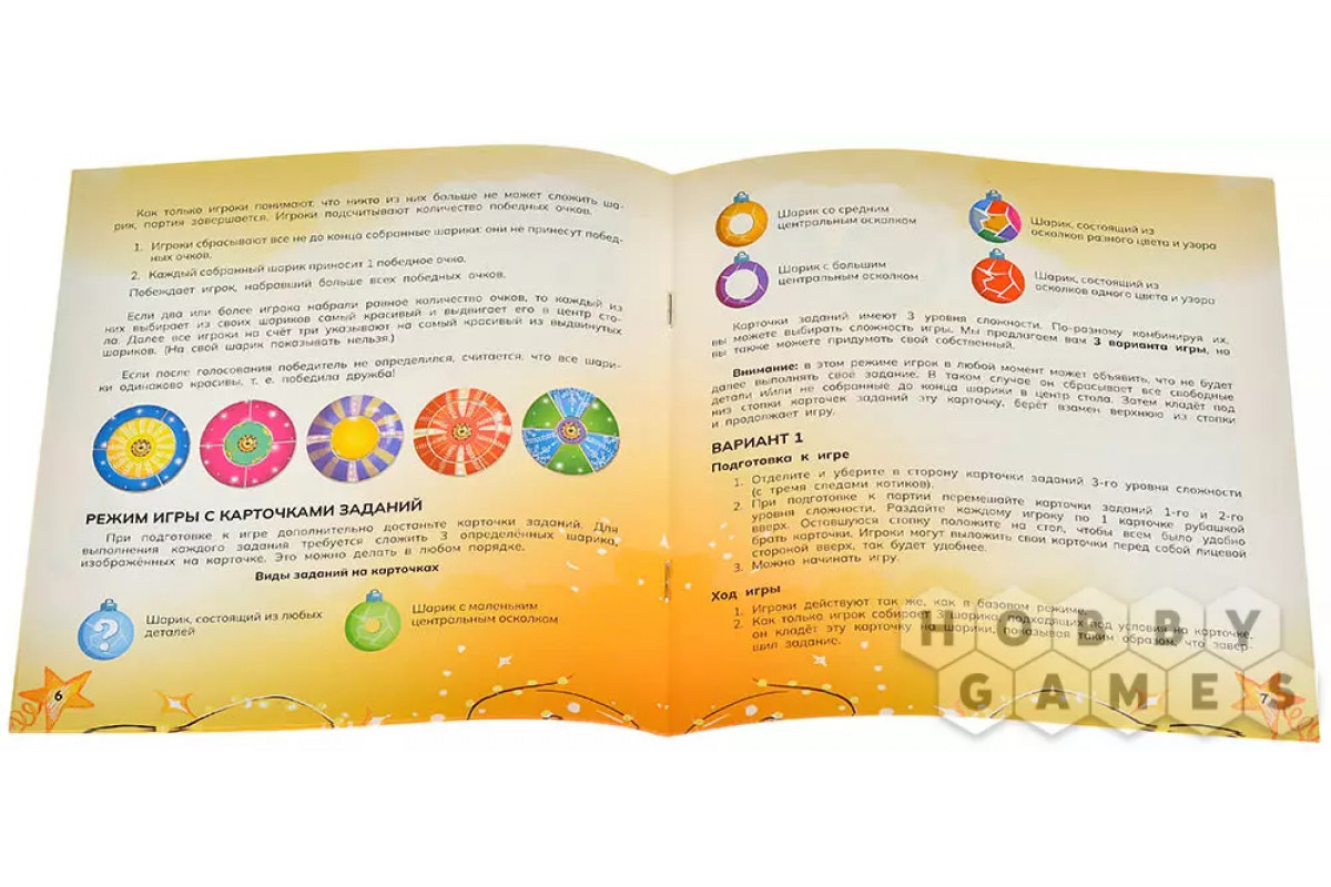 Правила у этой весёлой игры элементарные. Просто высыпайте все компоненты на стол – и можно приступать. Ищите подходящие детали, собирайте ёлочные шары быстрее остальных участников и зарабатывайте за это победные очки. А чтобы состязание стало ещё азартнее, в игре предусмотрены специальные карточки с дополнительными заданиями. Кто в итоге окажется самым проворным и наберёт больше всех очков – тот и станет победителем!