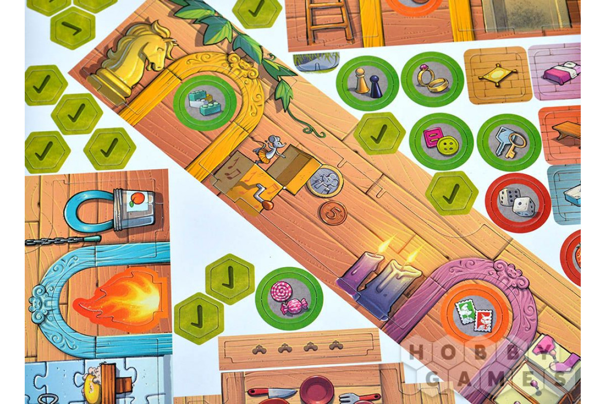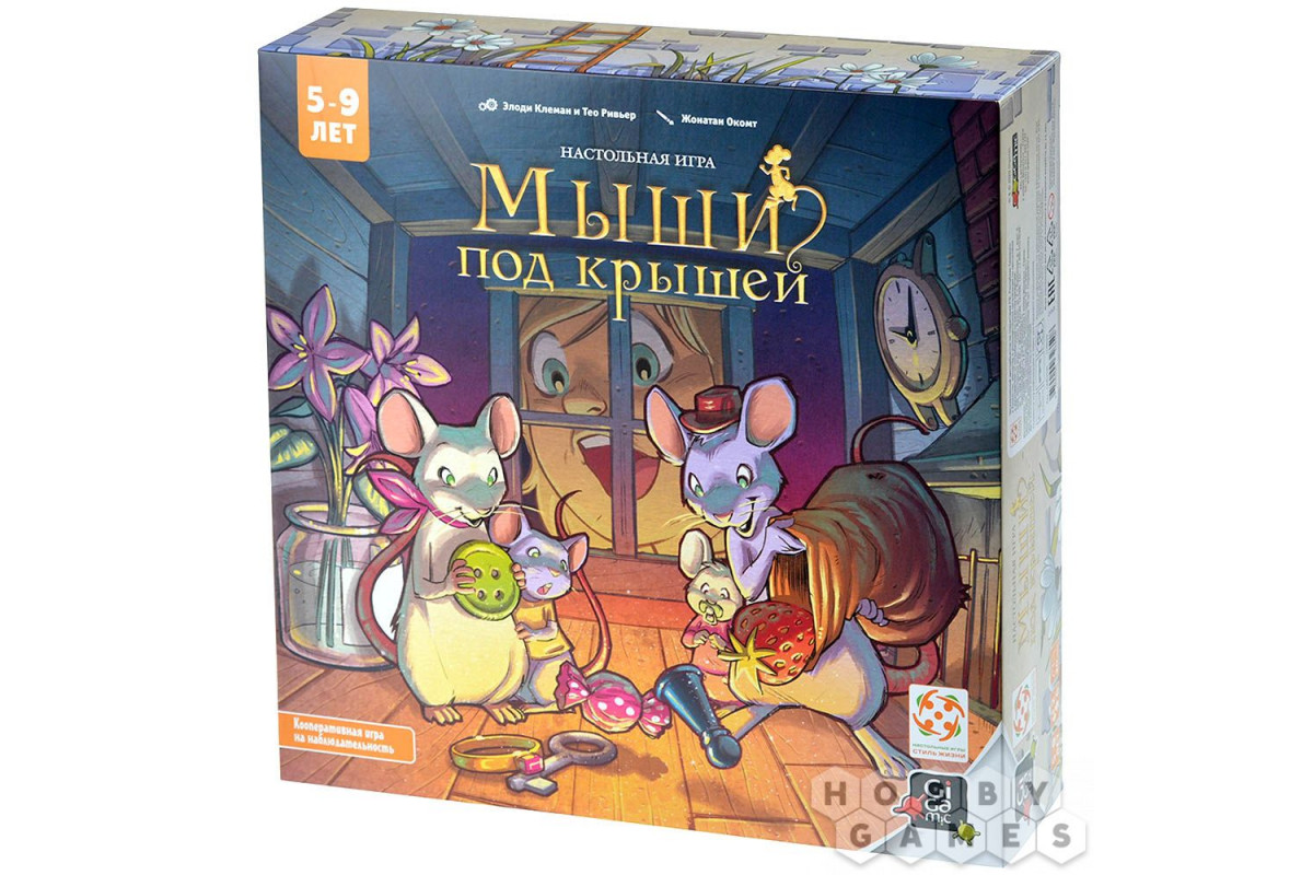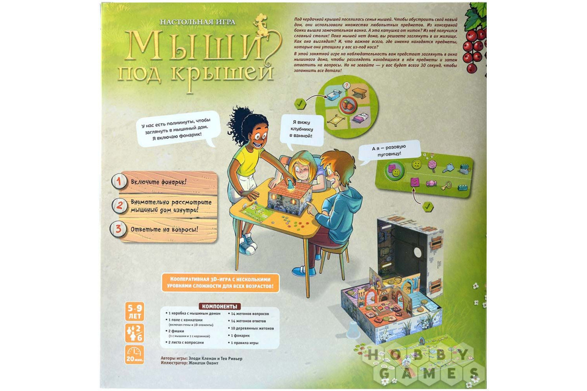 "Мыши под крышей" – это весёлая кооперативная игра на внимание и память для детей в возрасте от 5 до 9 лет. Она завораживает и привлекает к себе внимание уже на этапе подготовки: игровое поле представляет собой настоящий трёхмерный домик с небольшими окошками и четырьмя разными комнатами внутри. Игроки будут освещать домик фонариком (входит в комплект) через крышу, чтобы символы внутри комнат стали видны. А затем у них будет 30 секунд на то, чтобы рассмотреть домик в окошки и запомнить, какой предмет в какой комнате находится. После этого на специальный лист вопроса попарно помещаются жетоны предметов и комнат. Например, жетон с нитками лежит рядом с жетоном спальни, игроки должны ответить, был ли этот предмет в спальне на самом деле или нет. Чем больше правильных ответов дадут юные игроки, тем больше победных очков они получат.