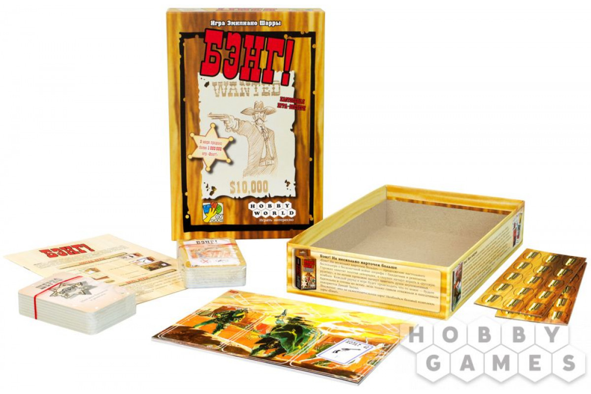 Настольная игра "Бэнг" – остросюжетный и закрученный вестерн, сочетающий в себе лучшее от карточных игр и Мафии – здесь Вам понадобится распознавать блеф и использовать дедукцию, чтобы раскусить, кто есть кто, в этой хитросплетённой перепалке. Напряжённая атмосфера, а также возможность подействовать не только словом, но и револьвером, подстёгивает игроков быть хитрыми и смекалистыми!