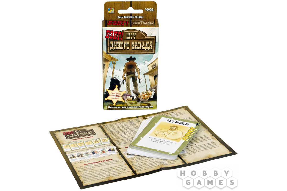 "Бэнг! Шоу Дикого Запада" – это эффектное дополнение для игры "Бэнг!", добавляющее в базовую версию восемь знакомых многим персонажей, каждый из которых обладает некоторыми особенностями. Также вы найдёте десяток свежих карт, благодаря которым вас ждут весьма неожиданные действия в процессе игры.