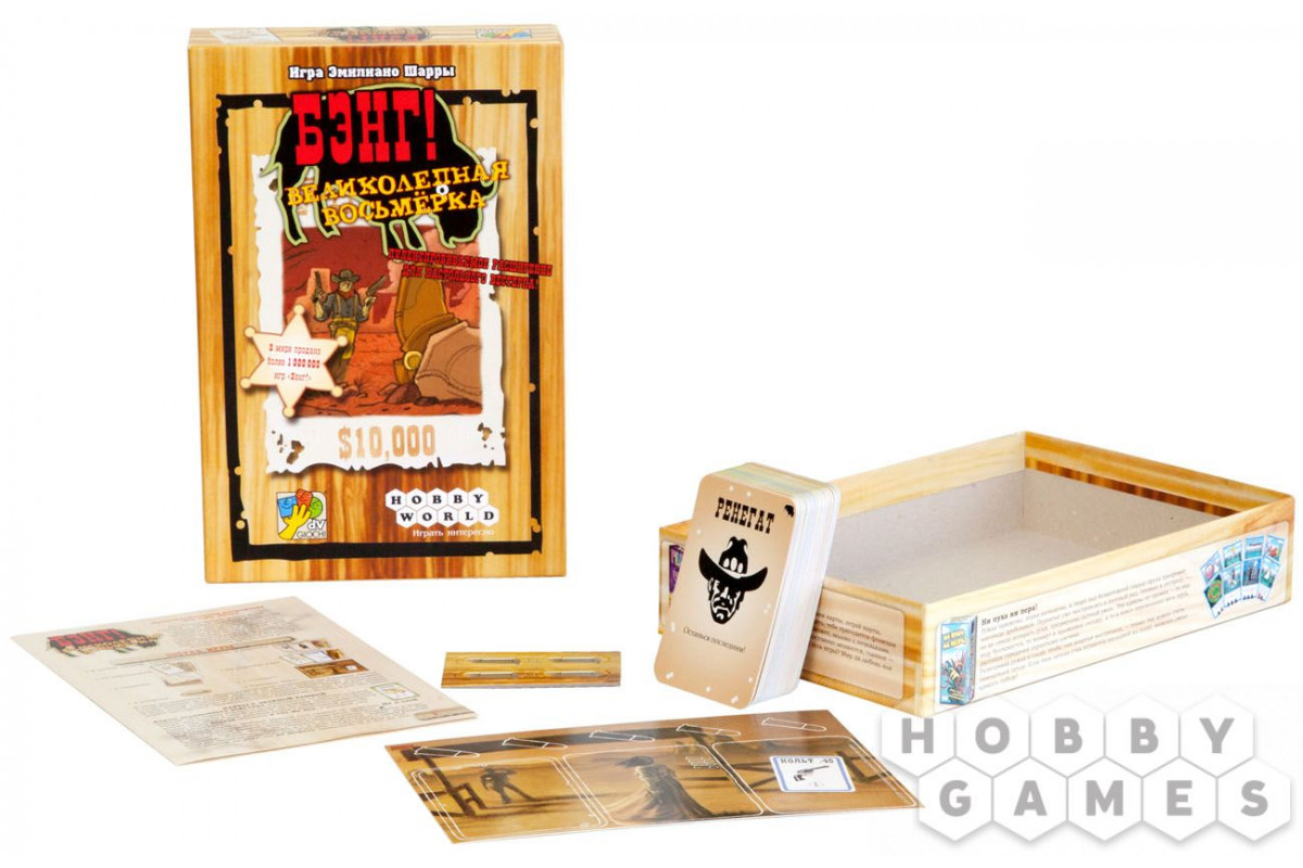 "Бэнг! Великолепная Восьмёрка" – расширение, которое значительно улучшит и разнообразит оригинальную базовую игру. Вы познакомитесь с 15 новыми персонажами и получите в своё распоряжение 40 игровых карт, но одним из главных нововведений, безусловно, является возможность игры ввосьмером!