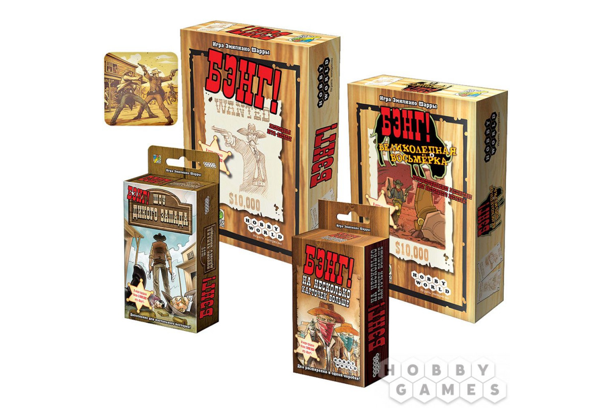 Где-то в пыльном городке Дикого Запада звенят шпоры, хлопают ставни салуна, а пальцы уже сжимают курки... В этом наборе вас ждёт классическая карточная игра "Бэнг!" и три дополнения – "Великолепная восьмёрка", "Шоу Дикого Запада" и "На несколько карточек больше" – всё со скидкой 15%. Готовы ли вы ввязаться в самую эпичную перестрелку на Диком Западе?