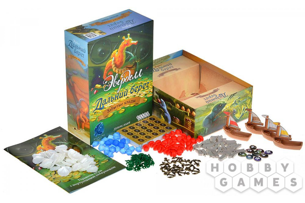 "Забытые клады" – это делюкс-набор, который преобразит ваши путешествия к дальнему берегу в лучшую сторону! Это самый настоящий сундук с сокровищами, под крышкой которого вы найдёте реалистичные ресурсы, большие пластиковые корабли, металлические якоря и перламутровые ракушки, заменяющие жетоны победных очков из базовой игры. Но клад находится под охраной Бонни Красной Клешни, что притаилась на дне коробки: этот грозный противник заставит вас приложить максимальные усилия для достижения победы. Вы можете сыграть против Бонни в одиночку или добавить в партию для 2-3 игроков. Отправьтесь в новые захватывающие приключения за забытыми кладами!