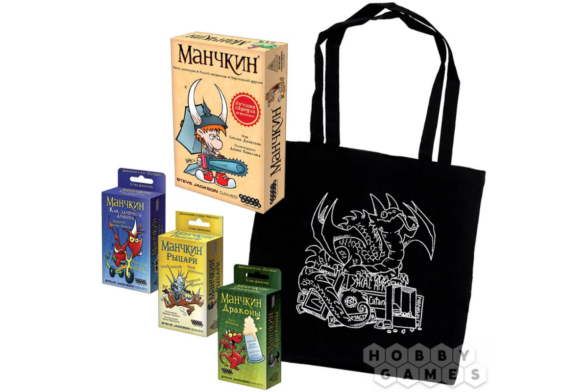 Набор включает в себя игры: "Манчкин", "Манчкин: Драконы", "Манчкин: Рыцари" и "Манчкин: Как замочить дракона", а также шоппер "Дракон на горе", со скидкой 15%.
