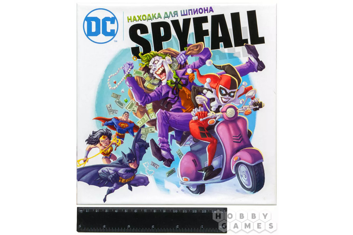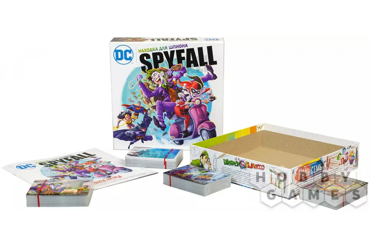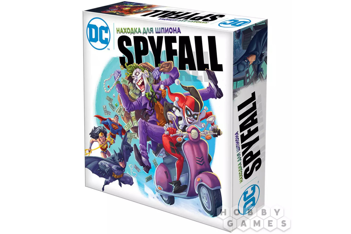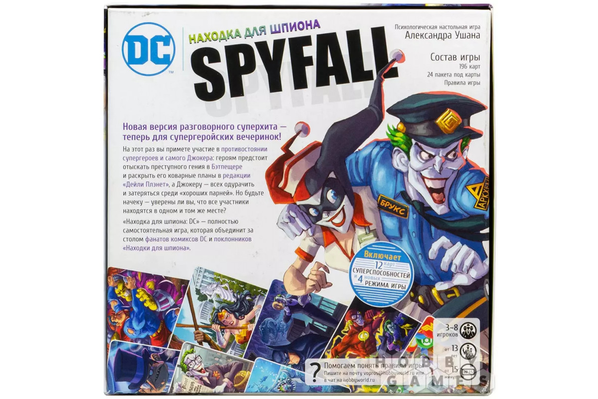 "Находка для шпиона: DC" – это новая версия известной разговорной игры, действие которой переносится совершенно в другую вселенную, а точнее – в мир комиксов DC. Это значит, что вас ждёт встреча с Бэтменом, Супермэном, Чудо-Женщиной и другими известными персонажами, главный из которых, конечно, сам Джокер. Почему так? Потому что именно он занял роль шпиона из предыдущих частей игры! Именно его вам предстоит раскрыть, используя свою память, дедукцию, умение блефовать и другие полезные навыки. Ну или блистательно разыграть свою коварную партию, играя за злодея. Место контршпионов теперь, конечно же, заняли супергерои.