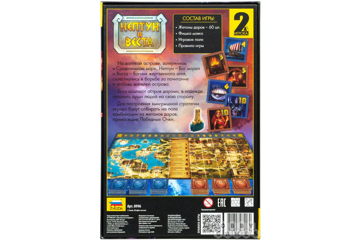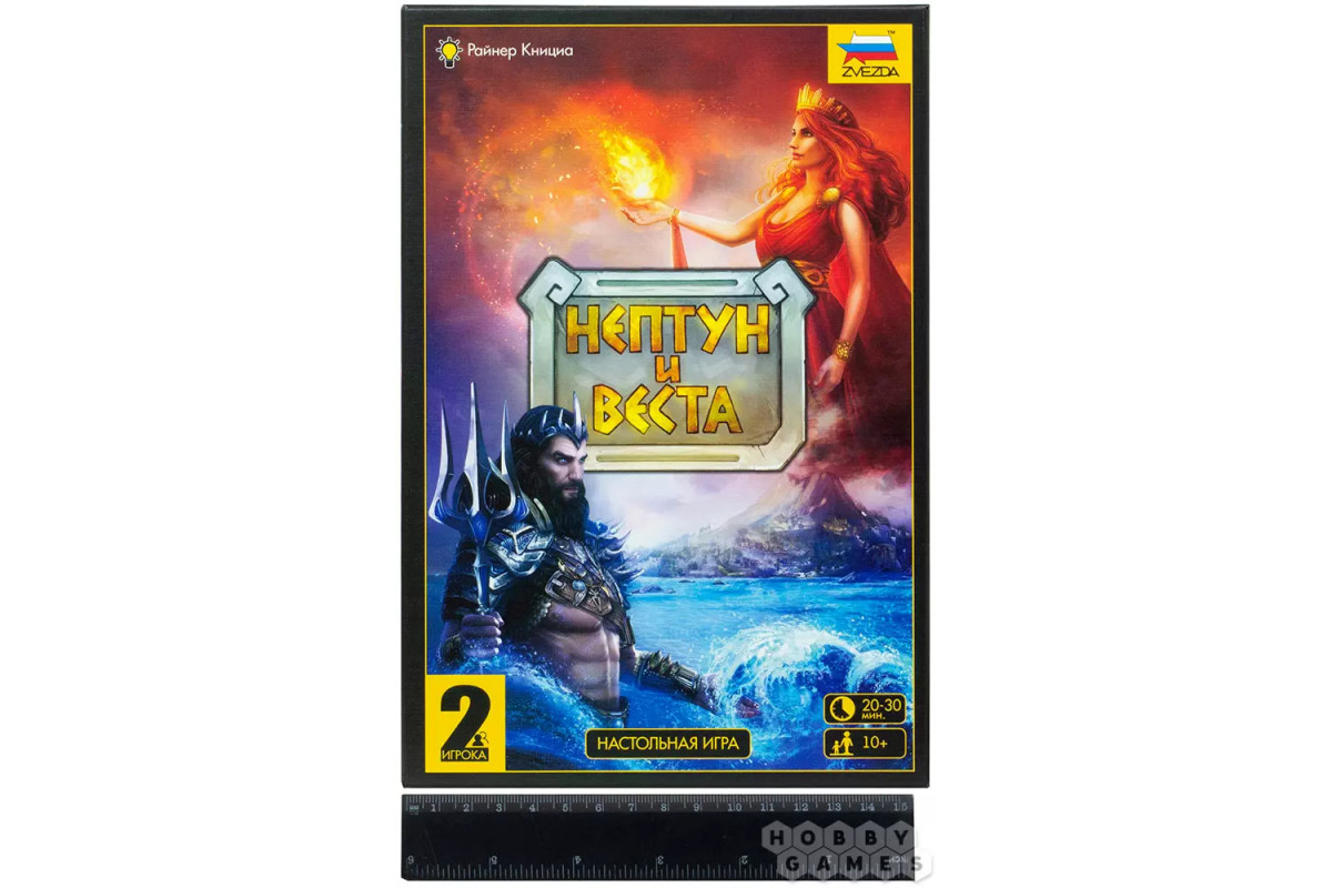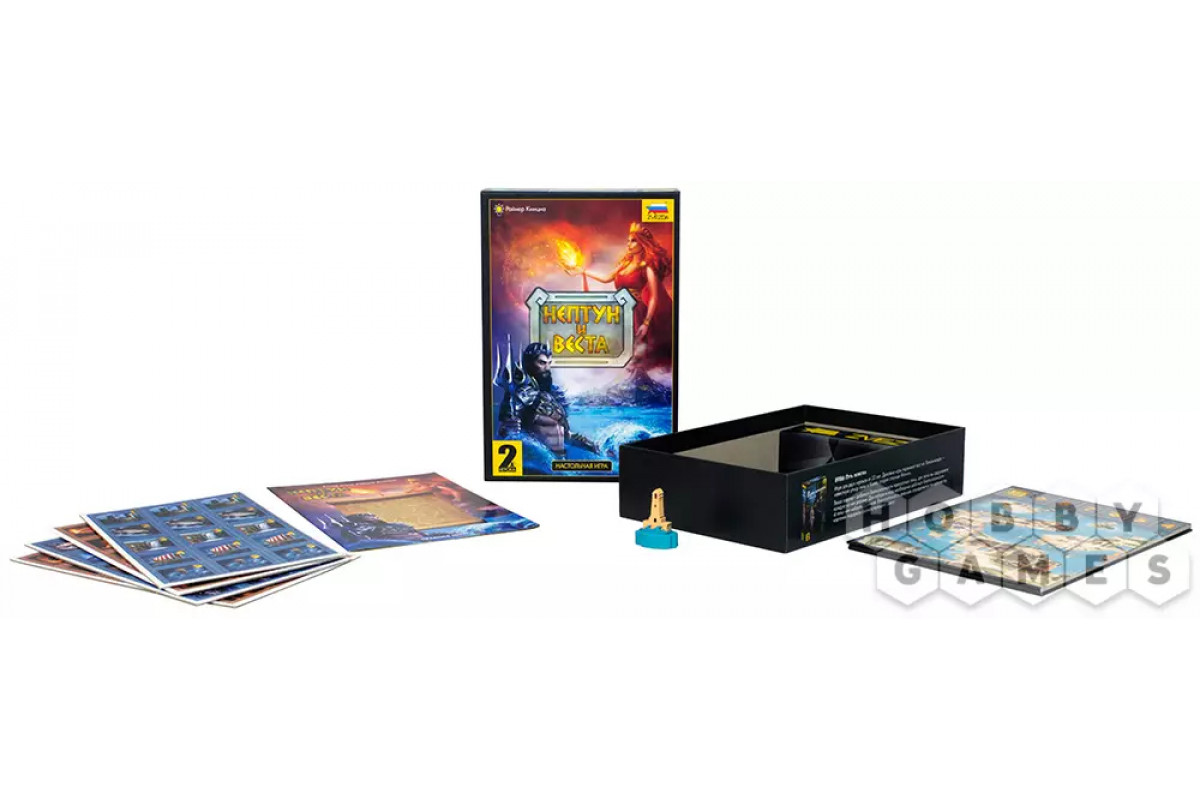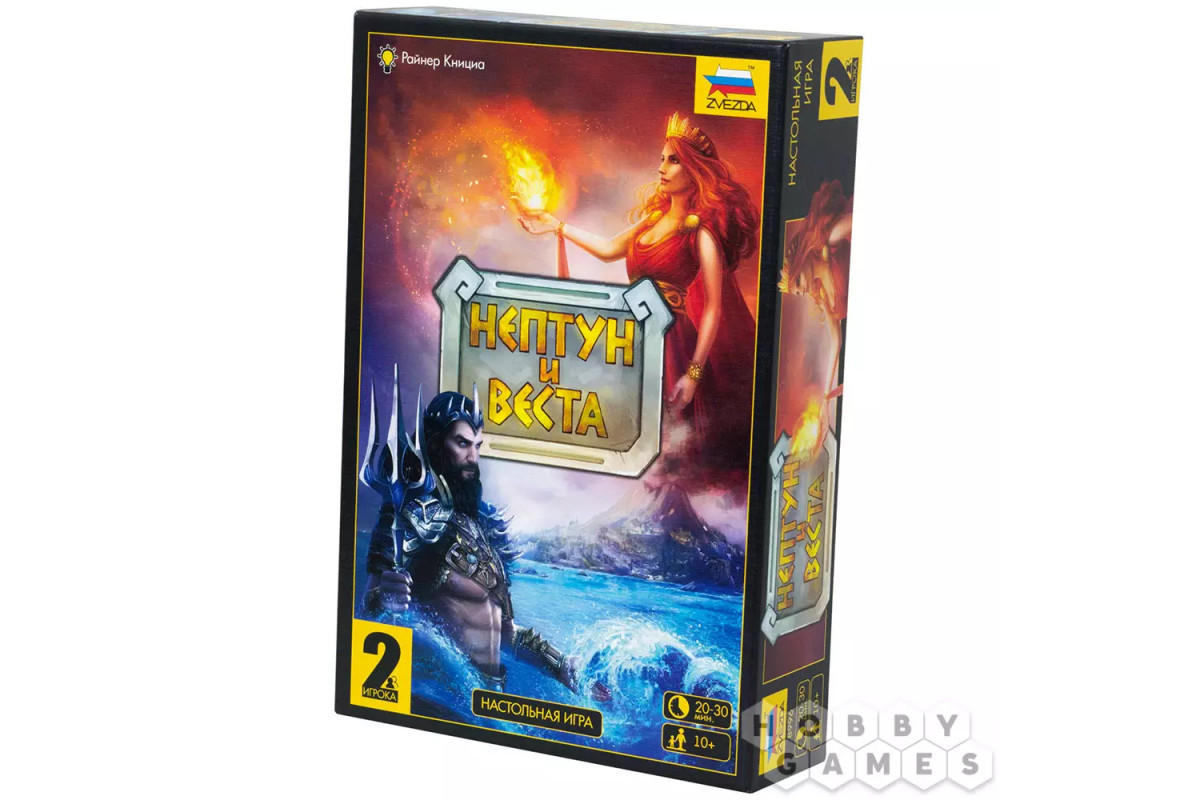 В настольной игре "Нептун и Веста" вы станете античными богами, которые борются между собой за место на острове. Механика действий заключается в сборе комбинаций и "перетягивании каната". В этой дуэльной игре необходимо сочетать жетоны на поле и приближаться к маяку фишками выбранного цвета. Отдадут ли жители побережья свою любовь богине огня, а поселенцы вулканического склона Нептуну? Ответ вы узнаете, когда первым дойдёте до шкалы под номером 10. Любовь сделает одного из богов сильнее, а слабый покинет остров навсегда!