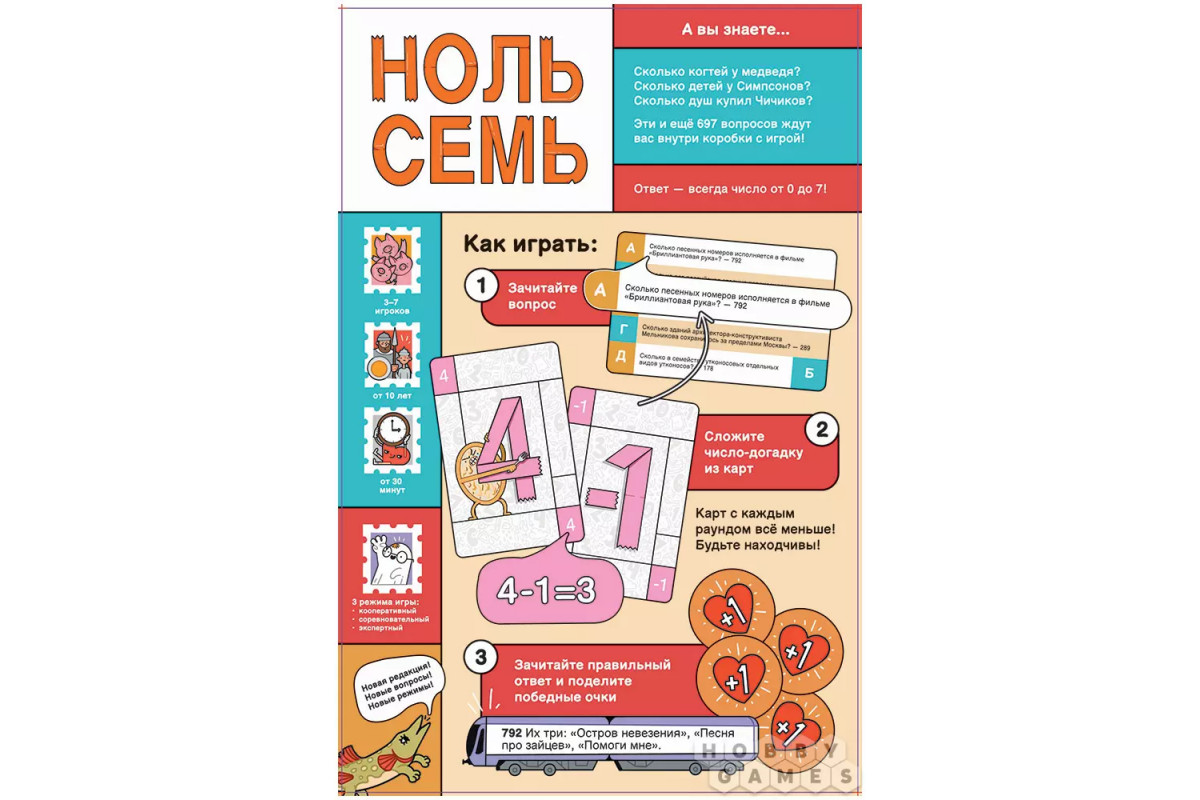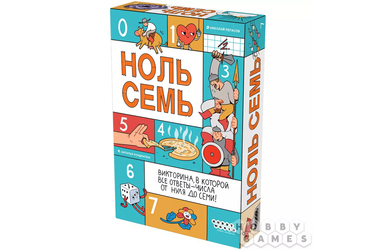 "Ноль семь" – быстрая настольная викторина, где все ответы находятся в диапазоне от 0 до 7. Вам предстоит отвечать на необычные, забавные и познавательные вопросы из самых разных областей – от истории и литературы до поп-культуры и повседневной жизни. Это прекрасный вариант развлечения для семейного вечера или небольшой вечеринки друзей, которым просто хочется весело, но с пользой провести время. А польза гарантирована – ведь вы не только разомнёте мозги, но и узнаете много новых фактов! Простые правила позволяют начать играть уже через пару минут, а сотни вопросов делают каждую партию непредсказуемой.