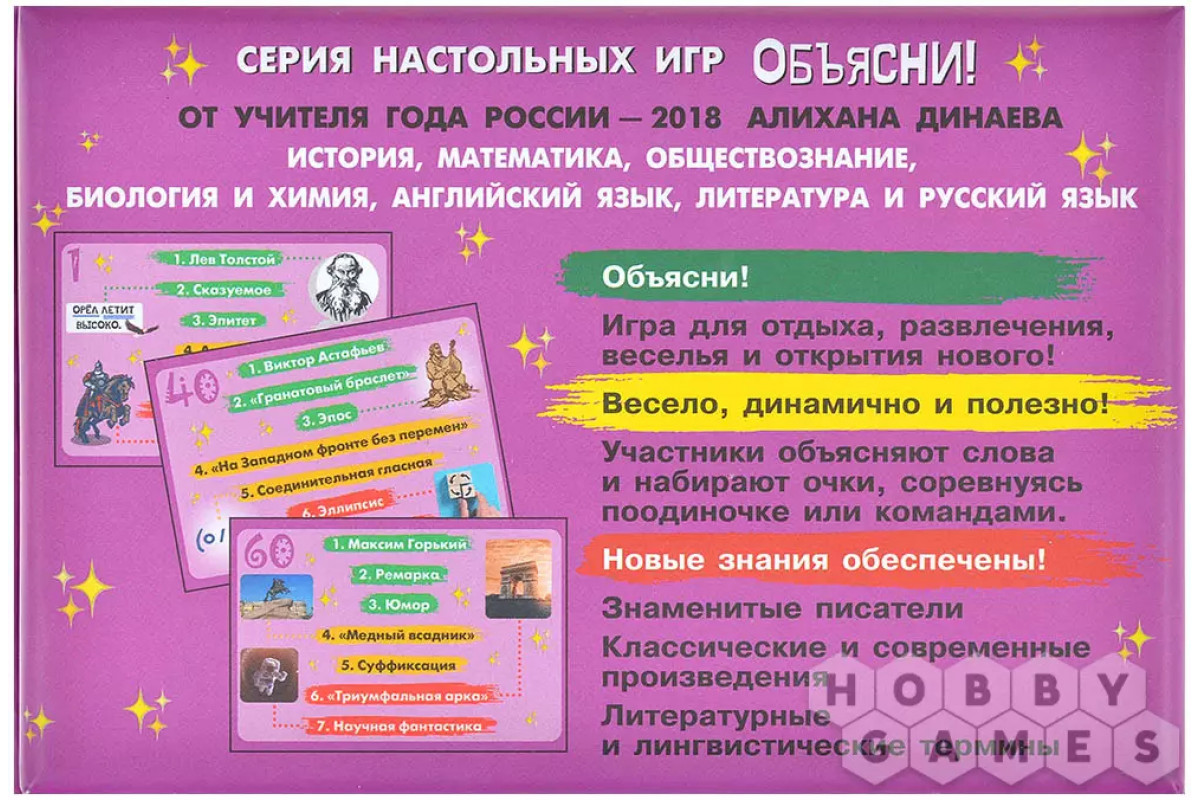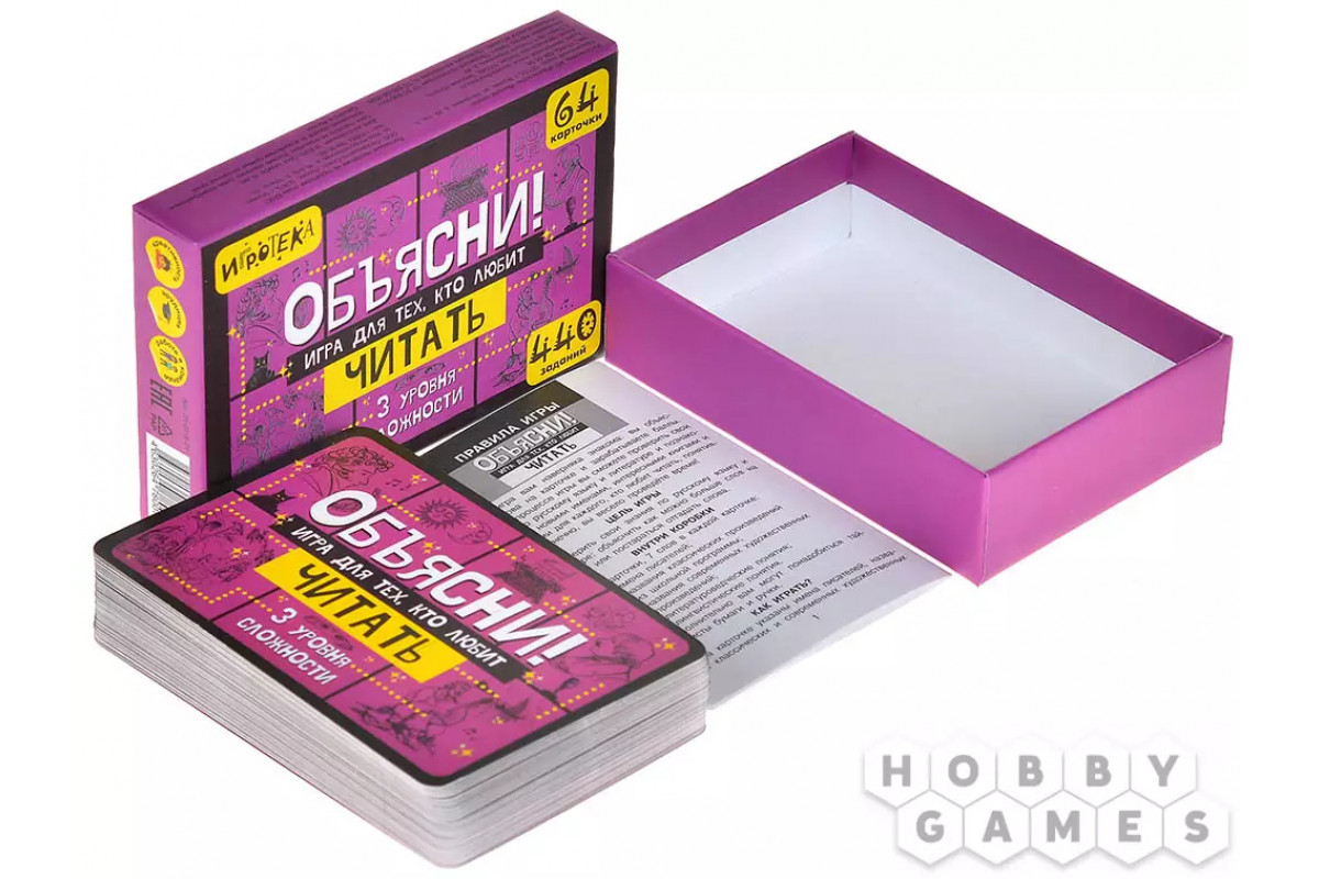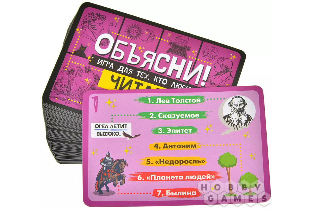 В коробке вас ждут 64 карточки, на которых собраны слова, разделённые на три уровня сложности. Здесь есть всё, чтобы проверить свою литературную эрудицию: важнейшие термины из области литературоведения и лингвистики, названия культовых произведений и фамилии писателей, вошедших в историю.