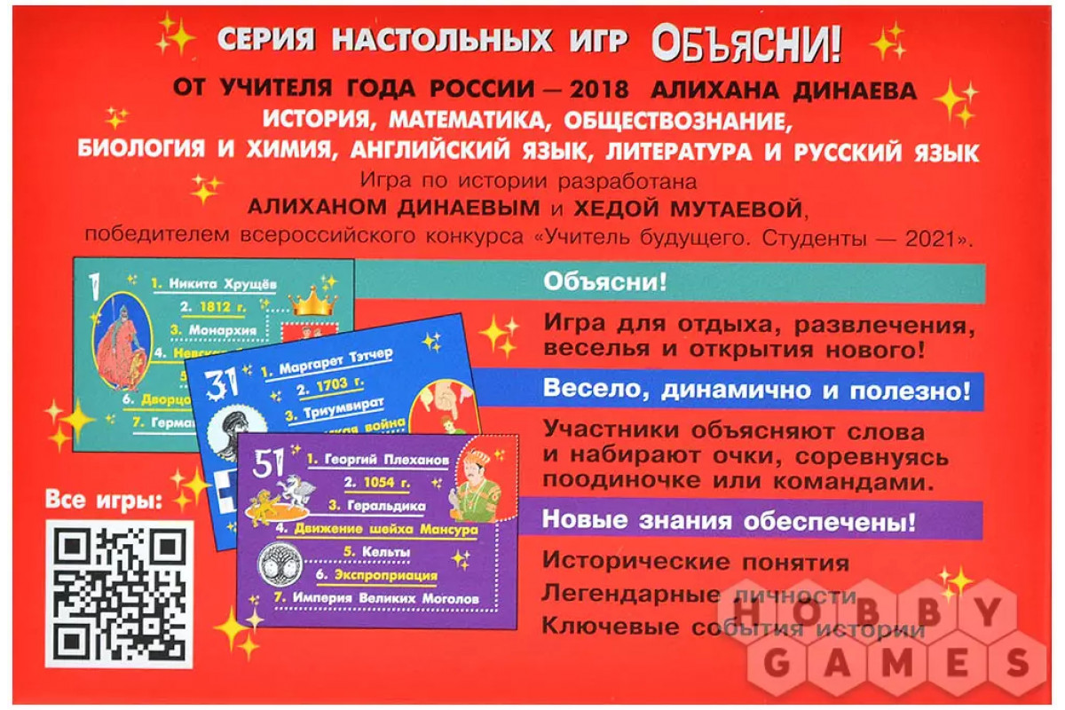 Правила просты и динамичны: участники объясняют друг другу загаданные понятия и зарабатывают очки. Выбирайте любой формат игры – можно сражаться в одиночку, доказывая свою эрудицию, или объединиться в команду, чтобы сообща восстановить хронологию веков.