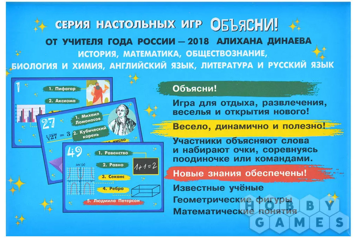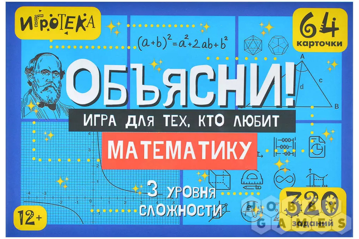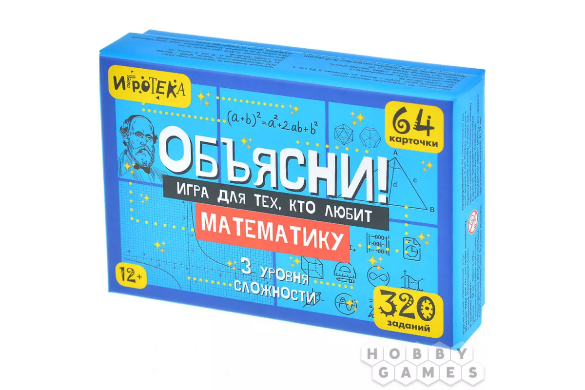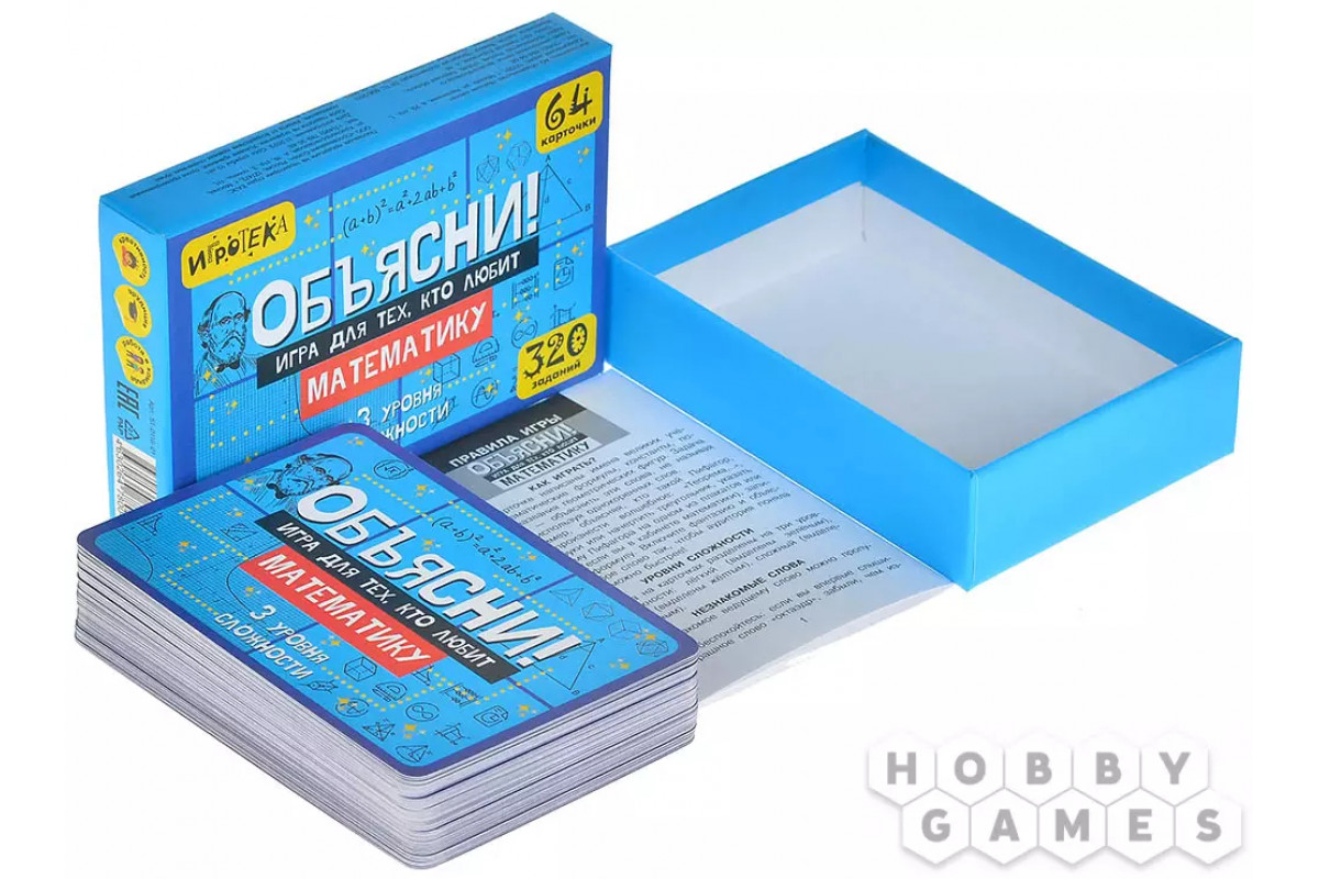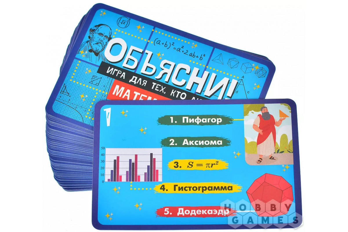 В наборе вас ждут 64 карточки с заданиями, разделёнными на три уровня сложности. Здесь соседствуют имена великих учёных, чьи открытия изменили мир, математические формулы и понятия, а также геометрические фигуры. Теперь объяснить теорему Пифагора или синусоиду можно не у доски, а в весёлой игре с друзьями!