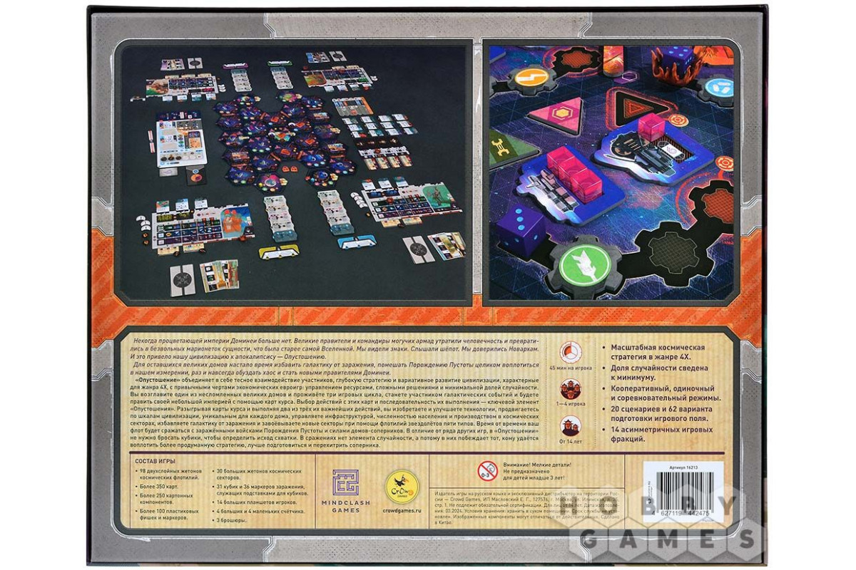 На протяжении трёх масштабных циклов вы будете принимать судьбоносные решения через уникальную механику карт курса, выбирая два из трёх ключевых действий каждый ход. Развивайте технологии, управляйте населением целых секторов, стройте могучие флотилии пяти классов и очищайте заражённые миры от скверны. Особенность "Опустошения" – абсолютное отсутствие случайности: в тактических битвах побеждает не удачный бросок кубика, а продуманная стратегия и грамотное планирование. Сражайтесь как с древним злом, так и с другими игроками, ведь только один дом сможет возродить Доминею из пепла. Это игра для истинных стратегов, где многообразие фракций и сценариев создаёт бесконечное поле для тактических экспериментов. Готовы ли вы принять вызов Пустоты?