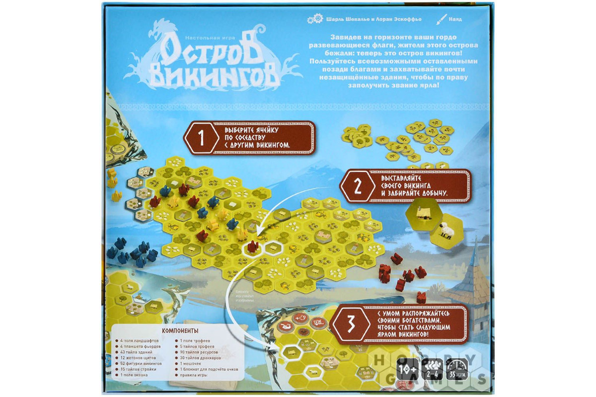 "Остров викингов" – стратегическая настольная игра, в которой вы возглавите клан отважных викингов, готовых бороться за господство на новом месте. Здесь каждый ваш ход – сражение между расчётом и жадностью, между хитрым планом и смелым риском. Игроки становятся вождями кланов, стремящихся захватить остров: штурмуют здания, собирают ресурсы, развивают свои фьорды и наполняют драккары добычей. Уникальная механика планирования действий и размещения жетонов даёт простор для стратегий, а яркие компоненты и визуальное оформление погружают в атмосферу северной саги. Вас ждут насыщенные партии, где вы будете строить, грабить, хитрить и бороться за титул ярла.