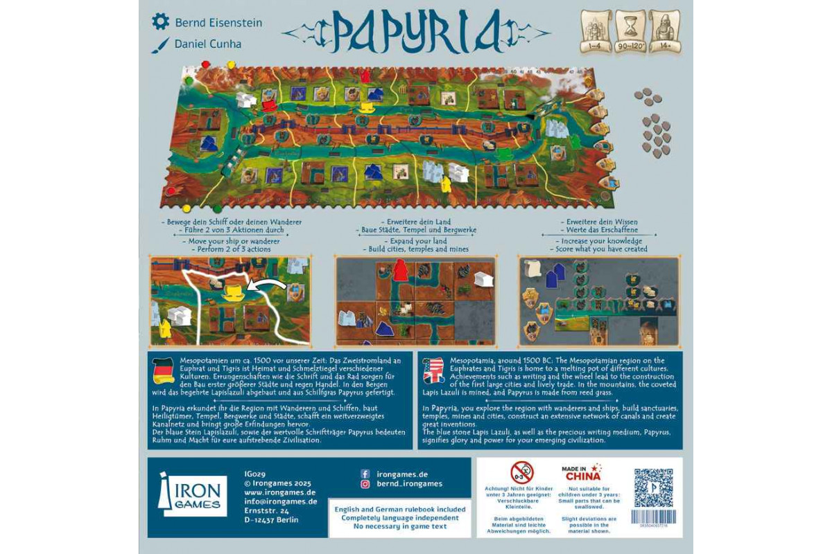 "In Papyria lenkt ihr die Geschicke eures Volkes, erkundet die Region mit Wanderern und Schiffen und schafft ein weitverzweigtes Kanalnetz. Ihr baut Tempel, Heiligtümer und Städte, bringt Erfindungen hervor und errichtet Bergwerke für das Lapis. Dieses kostbare Gestein und der wertvolle Schriftträger Papyrus führen eure aufstrebende Zivilisation zu Ruhm und Sieg.Während deines Zuges bewegst du deinen Wanderer oder dein Schiff. Auf dem Zielfeld wählst du zwei der drei möglichen Aktionen. Das kann ein neues Plättchen für die Auslage oder ein Multiplikator für eine spätere Wertung sein, der Bau einer Stadt, eines Tempels oder einer Mine oder die Produktion von Lapis oder Papyrus, die ihr für Gebäude, Sonderaktionen oder Zusatzwertungen benötigt.Das Spiel endet, sobald das letzte Gut von mehreren Feldern genommen wurde und eine bestimmte Anzahl an Spielende-Plättchen aufgedeckt und erfüllt wurden."