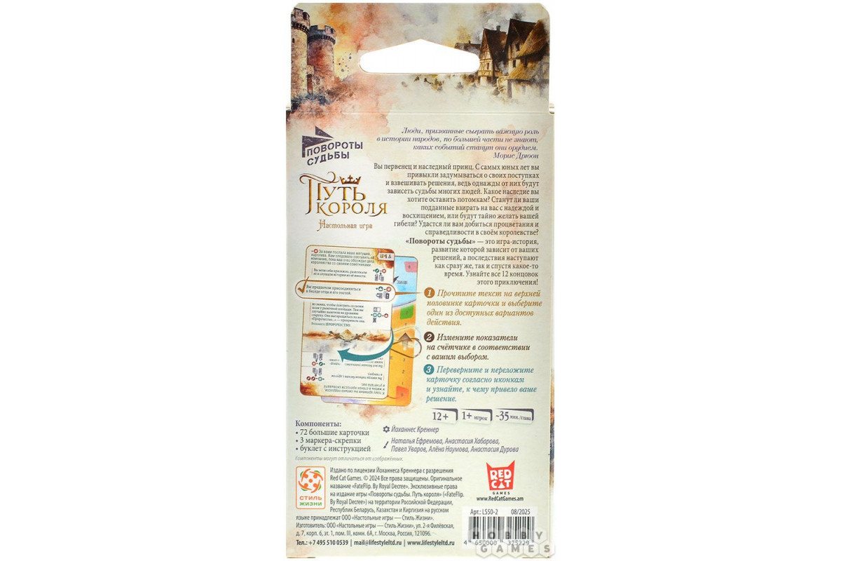 "Повороты судьбы: Путь короля" – увлекательная нарративная игра, в которой вы проживёте жизнь принца на пути к трону. Читайте карточки с событиями, принимайте решения и следите за четырьмя ключевыми показателями. Ваши выборы влияют на сюжет мгновенно и в перспективе, а собранные предметы и уникальные титулы делают каждую партию неповторимой. Погрузитесь в атмосферу средневековья с красивыми иллюстрациями и продуманной механикой, где вы – творец своей судьбы.